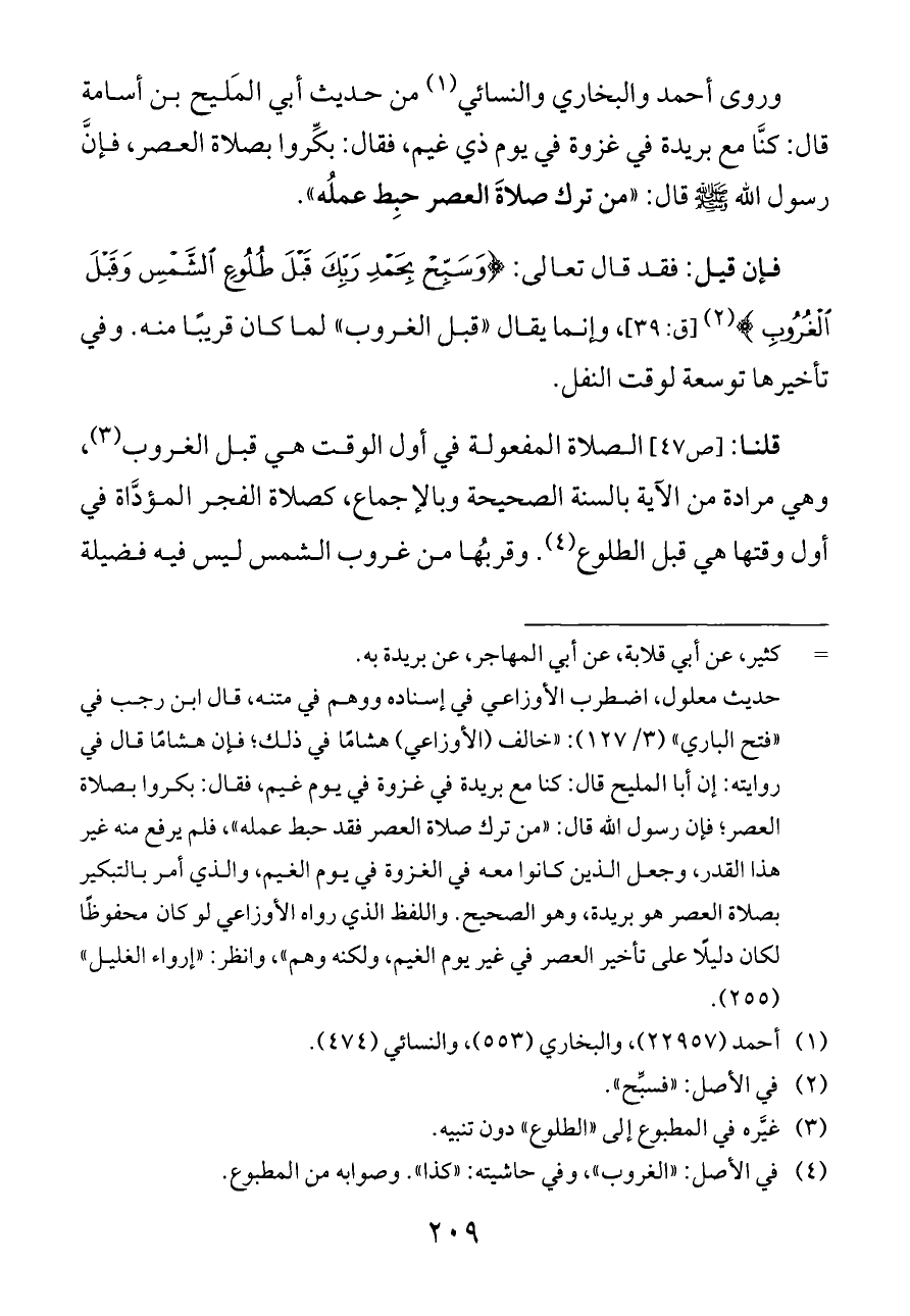قلنا: [ص ٤٧] الصلاة المفعولة في أول الوقت هي قبل الغروب (¬٣)، وهي مرادة من الآية بالسنة الصحيحة وبالإجماع، كصلاة الفجر المؤدَّاة في أول وقتها هي قبل الطلوع (¬٤). وقربُها من غروب الشمس ليس فيه فضيلة