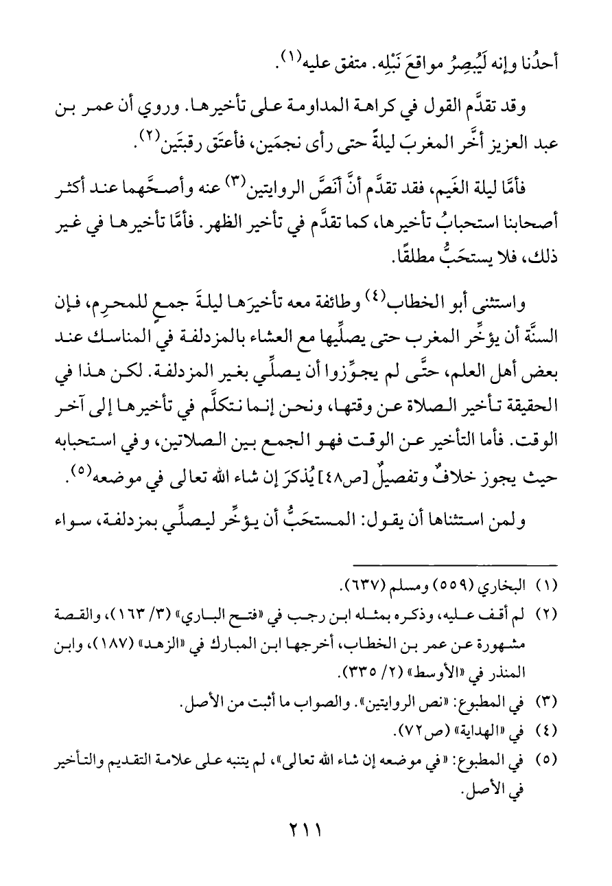 واستثنى أبو الخطاب (¬٤) وطائفة معه تأخيرَها ليلةَ جمعٍ للمحرِم، فإن السنَّة أن يؤخِّر المغرب حتى يصلِّيها مع العشاء بالمزدلفة في المناسك عند بعض أهل العلم، حتَّى لم يجوِّزوا أن يصلِّي بغير المزدلفة. لكن هذا في الحقيقة تأخير الصلاة عن وقتها، ونحن إنما نتكلَّم في تأخيرها إلى آخر الوقت. فأما التأخير عن الوقت فهو الجمع بين الصلاتين، وفي استحبابه حيث يجوز خلافٌ وتفصيلٌ [ص ٤٨] يُذكرَ إن شاء الله تعالى في موضعه (¬٥).