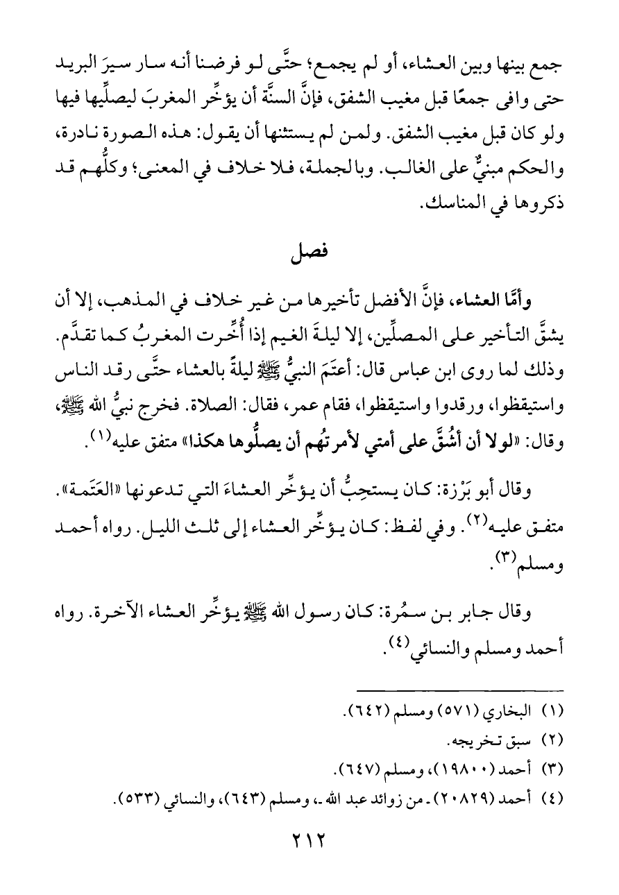 وقال جابر بن سمُرة: كان رسول الله - صلى الله عليه وسلم - يؤخِّر العشاء الآخرة. رواه أحمد ومسلم والنسائي (¬٤).