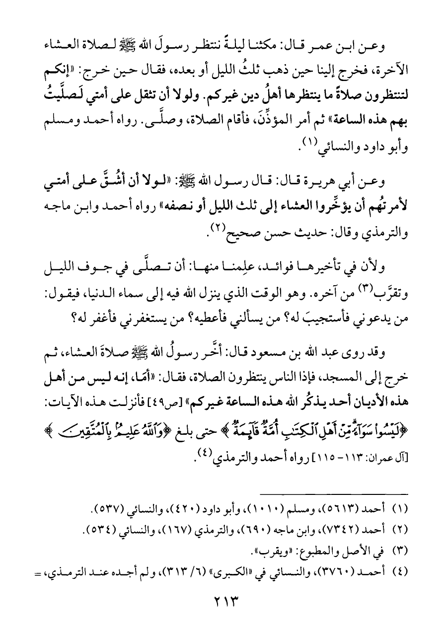 وقد روى عبد الله بن مسعود قال: أخَّر رسولُ الله - صلى الله عليه وسلم - صلاةَ العشاء، ثم خرج إلى المسجد، فإذا الناس ينتظرون الصلاة، فقال: «أمَا، إنه ليس من أهل هذه الأديان أحد يذكُر الله هذه الساعة غيركم» [ص ٤٩] فأنزلت هذه الآيات: {لَيْسُوا سَوَاءً مِنْ أَهْلِ الْكِتَابِ أُمَّةٌ قَائِمَةٌ} حتى بلغ {وَاللَّهُ عَلِيمٌ بِالْمُتَّقِينَ} [آل عمران: ١١٣ - ١١٥] رواه أحمد والترمذي (¬٤).