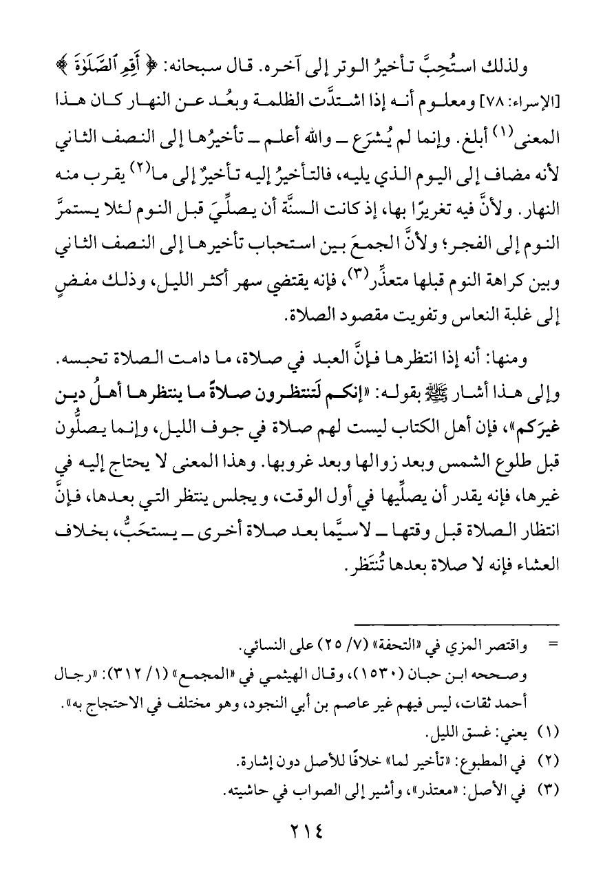 ولذلك استُحِبَّ تأخيرُ الوتر إلى آخره. قال سبحانه: {أَقِمِ الصَّلَاةَ} [الإسراء: ٧٨] ومعلوم أنه إذا اشتدَّت الظلمة وبعُد عن النهار كان هذا المعنى (¬١) أبلغ. وإنما لم يُشرَع ــ والله أعلم ــ تأخيرُها إلى النصف الثاني لأنه مضاف إلى اليوم الذي يليه، فالتأخيرُ إليه تأخيرٌ إلى ما (¬٢) يقرب منه النهار. ولأنَّ فيه تغريرًا بها، إذ كانت السنَّة أن يصلِّيَ قبل النوم لئلا يستمرَّ النوم إلى الفجر؛ ولأنَّ الجمعَ بين استحباب تأخيرها إلى النصف الثاني وبين كراهة النوم قبلها متعذِّر (¬٣)، فإنه يقتضي سهر أكثر الليل، وذلك مفضٍ إلى غلبة النعاس وتفويت مقصود الصلاة.