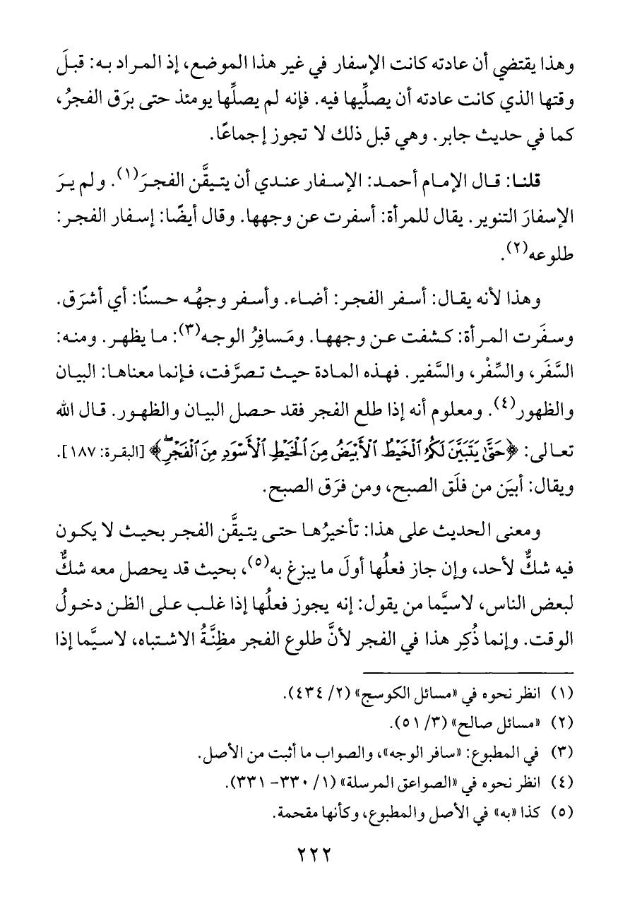 وهذا لأنه يقال: أسفر الفجر: أضاء. وأسفر وجهُه حسنًا: أي أشرَق. وسفَرت المرأة: كشفت عن وجهها. ومَسافِرُ الوجه (¬٣): ما يظهر. ومنه: السَّفَر، والسِّفْر، والسَّفير. فهذه المادة حيث تصرَّفت، فإنما معناها: البيان والظهور (¬٤). ومعلوم أنه إذا طلع الفجر فقد حصل البيان والظهور. قال الله تعالى: {حَتَّى يَتَبَيَّنَ لَكُمُ الْخَيْطُ الْأَبْيَضُ مِنَ الْخَيْطِ الْأَسْوَدِ مِنَ الْفَجْرِ} [البقرة: ١٨٧]. ويقال: أبيَن من فلَق الصبح، ومن فرَق الصبح.