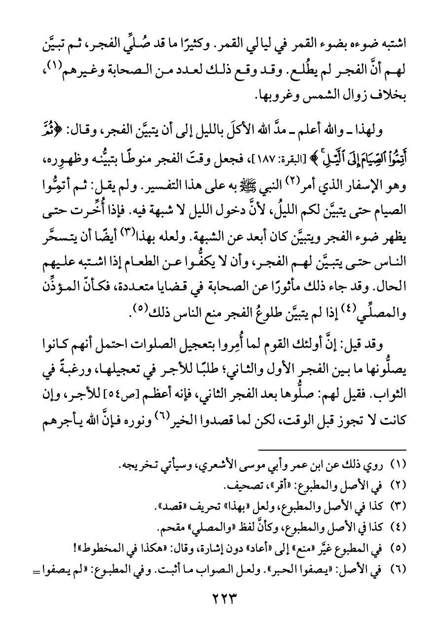 ولهذا ــ والله أعلم ــ مدَّ الله الأكلَ بالليل إلى أن يتبيَّن الفجر، وقال: {ثُمَّ أَتِمُّوا الصِّيَامَ إِلَى اللَّيْلِ} [البقرة: ١٨٧]، فجعل وقتَ الفجر منوطًا بتبيُّنه وظهوِره، وهو الإسفار الذي أمر (¬٢) النبي - صلى الله عليه وسلم - به على هذا التفسير. ولم يقل: ثم أتِمُّوا الصيام حتى يتبيَّن لكم الليلُ، لأنَّ دخول الليل لا شبهة فيه. فإذا أُخِّرت حتى يظهر ضوء الفجر ويتبيَّن كان أبعد عن الشبهة. ولعله بهذا (¬٣) أيضًا أن يتسحَّر الناس حتى يتبيَّن لهم الفجر، وأن لا يكفُّوا عن الطعام إذا اشتبه عليهم الحال. وقد جاء ذلك مأثورًا عن الصحابة في قضايا متعددة، فكأنّ المؤذِّن والمصلِّي (¬٤) إذا لم يتبيَّن طلوعُ الفجر منع الناس ذلك (¬٥).
