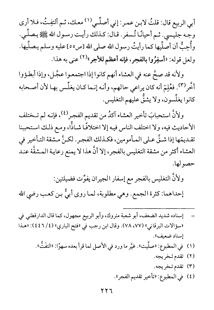 أبي الربيع قال: قلتُ لابن عمر: إني أصلِّي (¬١) معك، ثم ألتفِتُ، فلا أرى وجه جليسي. ثم أحيانًا تُسفر. قال: كذلك رأيت رسول الله - صلى الله عليه وسلم - يصلِّي. وأُحِبُّ أن أصلِّيها كما رأيتُ رسول الله صلى الله [ص ٥٥] عليه وسلم يصلِّيها. ولعل قوله: «أسفِرُوا بالفجر، فإنه أعظم للأجر» (¬٢) عنى به هذا.