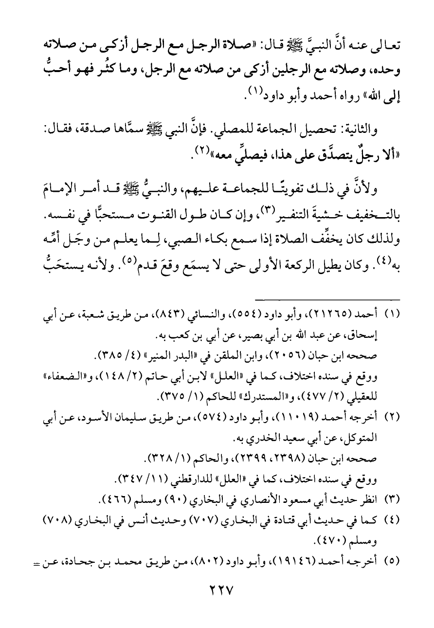 تعالى عنه أنَّ النبيَّ - صلى الله عليه وسلم - قال: «صلاة الرجل مع الرجل أزكى من صلاته وحده، وصلاته مع الرجلين أزكى من صلاته مع الرجل، وما كثُر فهو أحبُّ إلى الله» رواه أحمد وأبو داود (¬١).
