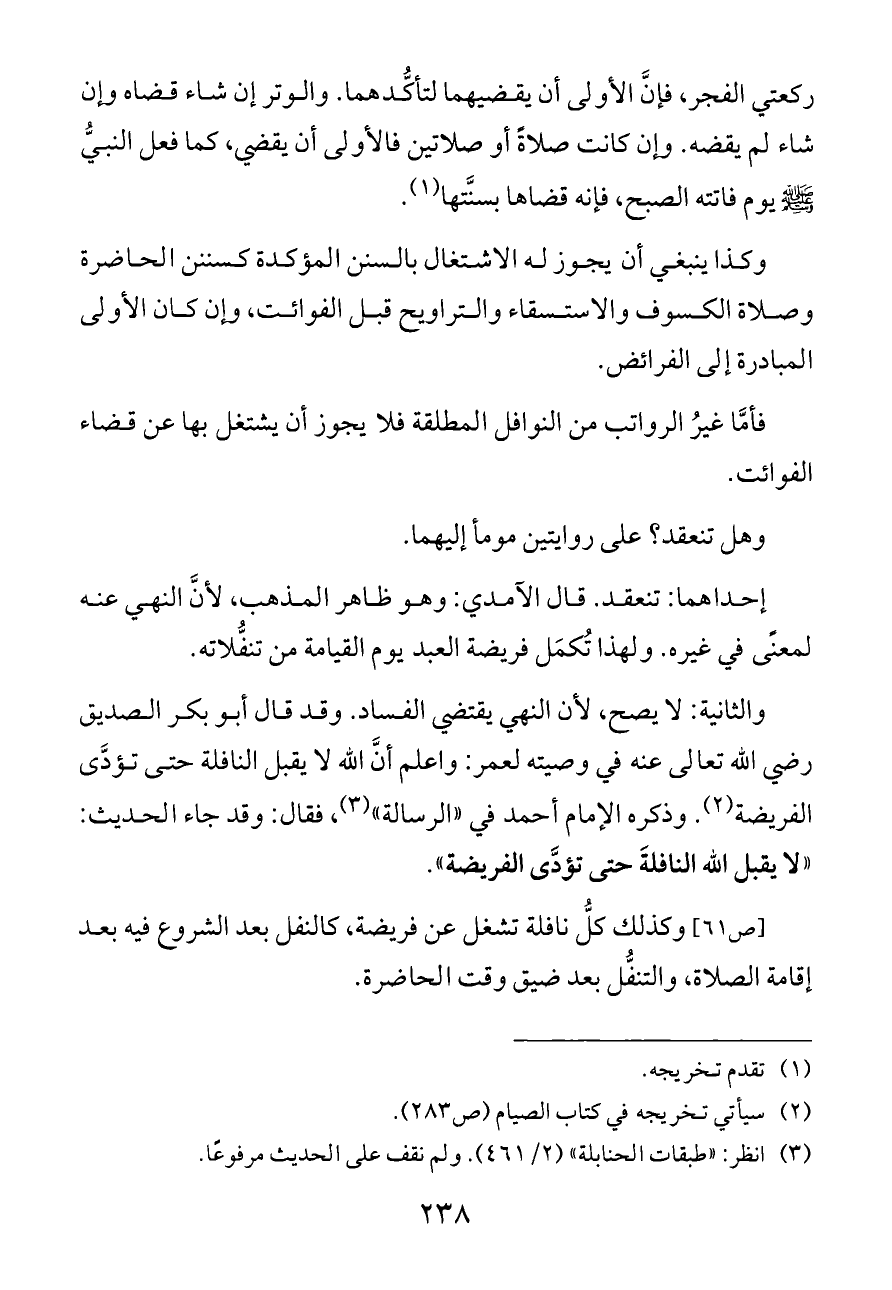 والثانية: لا يصح، لأن النهي يقتضي الفساد. وقد قال أبو بكر الصديق رضي الله تعالى عنه في وصيته لعمر: واعلم أنَّ الله لا يقبل النافلة حتى تؤدَّى الفريضة (¬٢). وذكره الإمام أحمد في «الرسالة» (¬٣)، فقال: وقد جاء الحديث: «لا يقبل الله النافلةَ حتى تؤدَّى الفريضة».