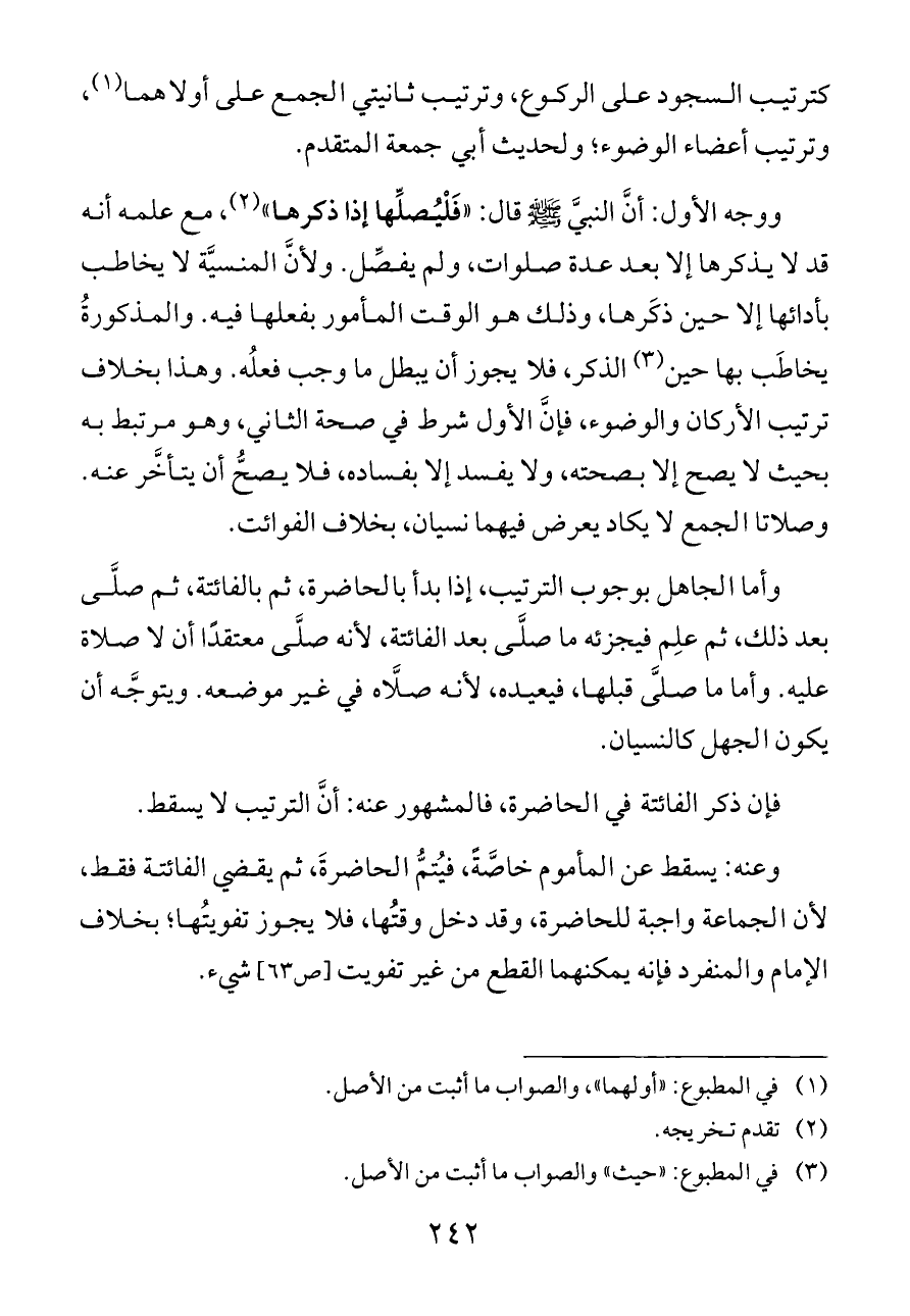 وأما الجاهل بوجوب الترتيب، إذا بدأ بالحاضرة، ثم بالفائتة، ثم صلَّى بعد ذلك، ثم علِم فيجزئه ما صلَّى بعد الفائتة، لأنه صلَّى معتقدًا أن لا صلاة عليه. وأما ما صلَّى قبلها، فيعيده، لأنه صلَّاه في غير موضعه. ويتوجَّه أن يكون الجهل كالنسيان.