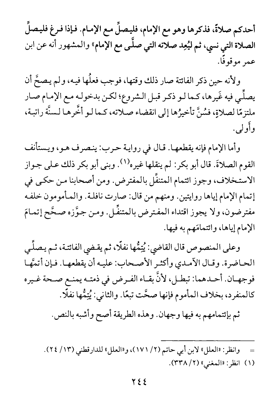 وأما الإمام فإنه يقطعها. قال في رواية حرب: ينصرف هو، ويستأنف القوم الصلاةَ. قال أبو بكر: لم ينقلها غيره (¬١). وبنى أبو بكر ذلك على جواز الاستخلاف، وجوز ائتمام المتنفِّل بالمفترض. ومن أصحابنا من حكى في إتمام الإمام إياها روايتين. ومنهم من قال: صارت نافلة. والمأمومون خلفه مفترضون، ولا يجوز اقتداء المفترض بالمتنفِّل. ومن جوَّزه صحَّح إتمامَ الإمام إياها، وائتمامَهم به فيها.