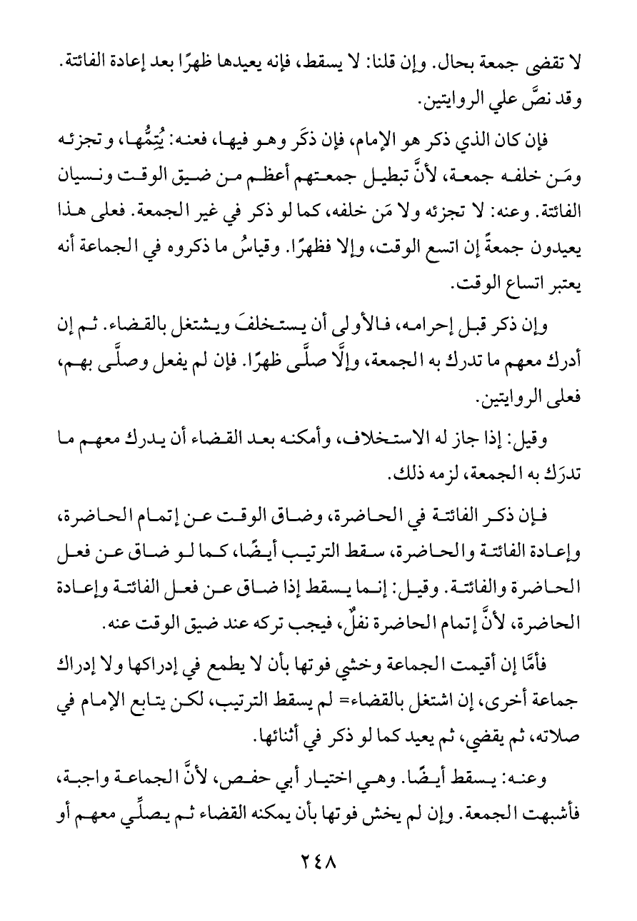 فإن كان الذي ذكر هو الإمام، فإن ذكَر وهو فيها، فعنه: يُتِمُّها، وتجزئه ومَن خلفه جمعة، لأنَّ تبطيل جمعتهم أعظم من ضيق الوقت ونسيان الفائتة. وعنه: لا تجزئه ولا مَن خلفه، كما لو ذكر في غير الجمعة. فعلى هذا يعيدون جمعةً إن اتسع الوقت، وإلا فظهرًا. وقياسُ ما ذكروه في الجماعة أنه يعتبر اتساع الوقت.