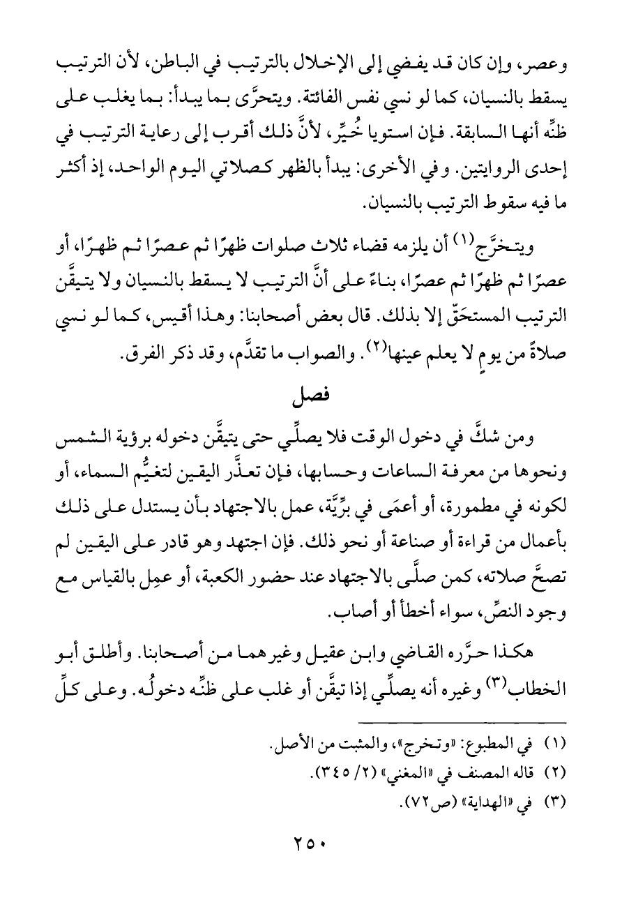 ويتخرَّج (¬١) أن يلزمه قضاء ثلاث صلوات ظهرًا ثم عصرًا ثم ظهرًا، أو عصرًا ثم ظهرًا ثم عصرًا، بناءً على أنَّ الترتيب لا يسقط بالنسيان ولا يتيقَّن الترتيب المستحَقّ إلا بذلك. قال بعض أصحابنا: وهذا أقيس، كما لو نسي صلاةً من يومٍ لا يعلم عينها (¬٢). والصواب ما تقدَّم، وقد ذكر الفرق.