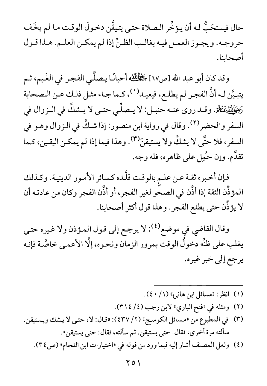 وقد كان أبو عبد الله [ص ٦٧]- رحمه الله - أحيانًا يصلِّي الفجر في الغَيم، ثم يتبيَّن له أنَّ الفجر لم يطلع، فيعيد (¬١)، كما جاء مثل ذلك عن الصحابة - رضي الله عنهم -. وقد روى عنه حنبل: لا يصلِّي حتى لا يشكَّ في الزوال في السفر والحضر (¬٢). وقال في رواية ابن منصور: إذا شكَّ في الزوال وهو في السفر، فلا حتَّى لا يشكَّ ولا يستيقنَ (¬٣). وهذا فيما إذا لم يمكن اليقين، كما تقدَّم. وإن حُمِل على ظاهره، فله وجه.