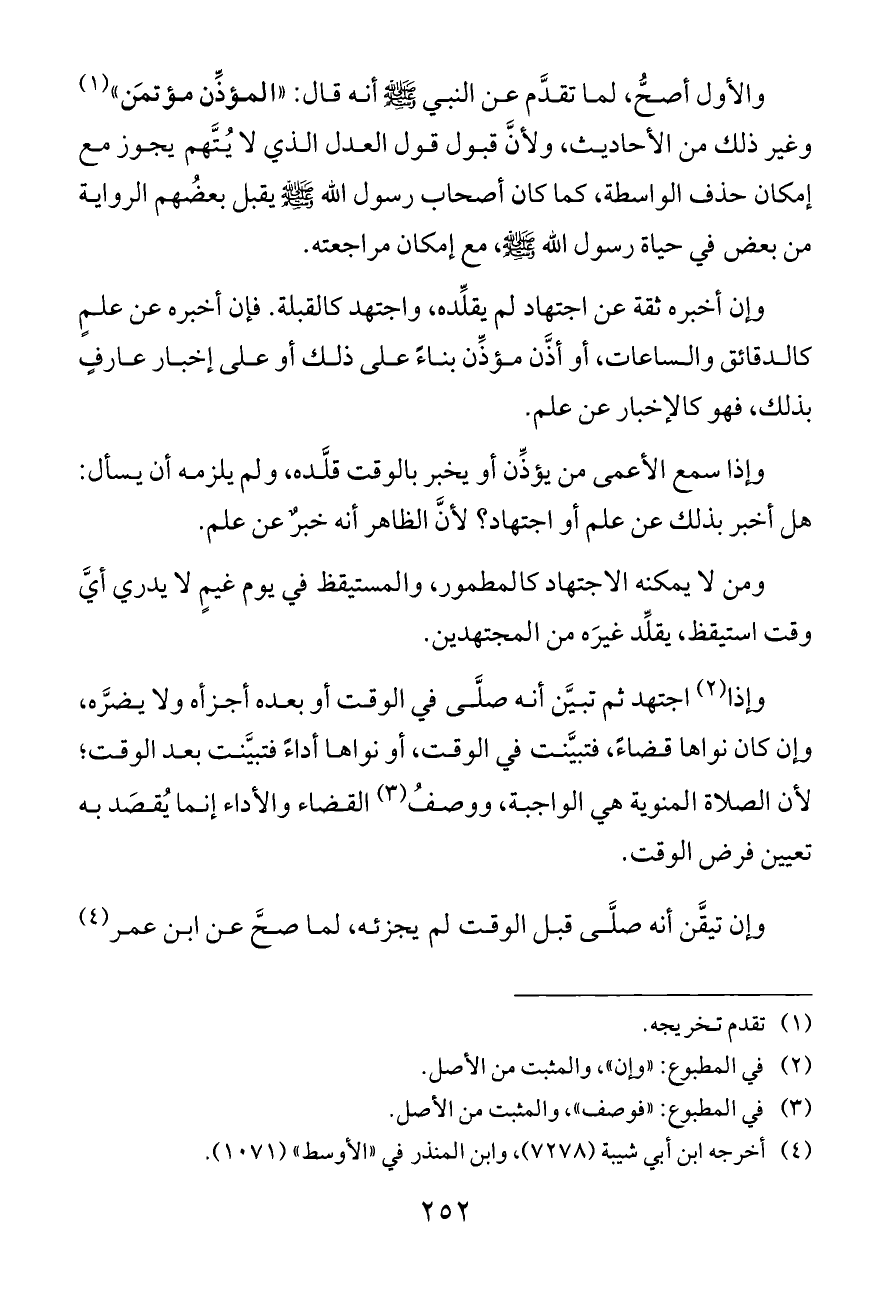 والأول أصحُّ، لما تقدَّم عن النبي - صلى الله عليه وسلم - أنه قال: «المؤذِّن مؤتمَن» (¬١) وغير ذلك من الأحاديث، ولأنَّ قبول قول العدل الذي لا يُتَّهم يجوز مع إمكان حذف الواسطة، كما كان أصحاب رسول الله - صلى الله عليه وسلم - يقبل بعضُهم الرواية من بعض في حياة رسول الله - صلى الله عليه وسلم -، مع إمكان مراجعته.
