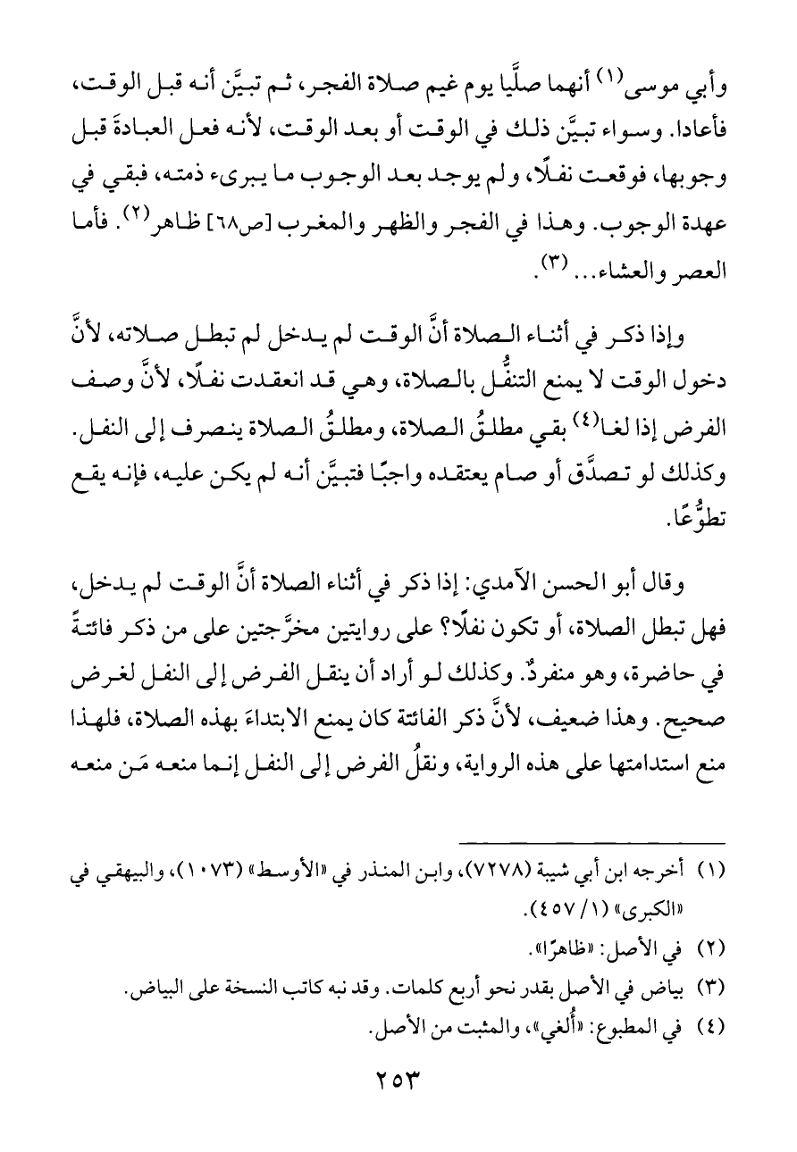 وقال أبو الحسن الآمدي: إذا ذكر في أثناء الصلاة أنَّ الوقت لم يدخل، فهل تبطل الصلاة، أو تكون نفلًا؟ على روايتين مخرَّجتين على من ذكر فائتةً في حاضرة، وهو منفردٌ. وكذلك لو أراد أن ينقل الفرض إلى النفل لغرض صحيح. وهذا ضعيف، لأنَّ ذكر الفائتة كان يمنع الابتداءَ بهذه الصلاة، فلهذا منع استدامتها على هذه الرواية، ونقلُ الفرض إلى النفل إنما منعه مَن منعه
