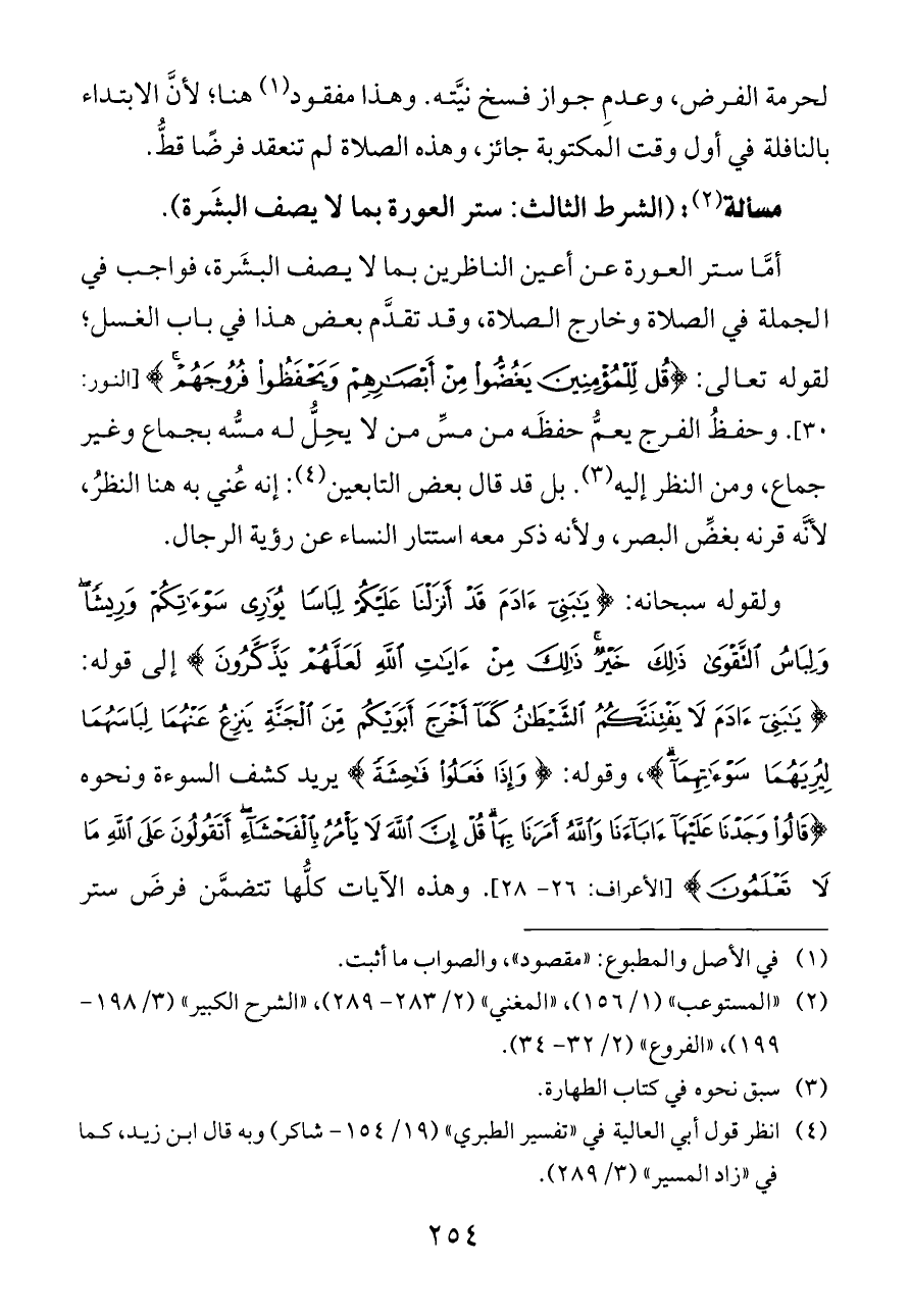 ولقوله سبحانه: {يَابَنِي آدَمَ قَدْ أَنْزَلْنَا عَلَيْكُمْ لِبَاسًا يُوَارِي سَوْآتِكُمْ وَرِيشًا وَلِبَاسُ التَّقْوَى ذَلِكَ خَيْرٌ ذَلِكَ مِنْ آيَاتِ اللَّهِ لَعَلَّهُمْ يَذَّكَّرُونَ} إلى قوله: {يَابَنِي آدَمَ لَا يَفْتِنَنَّكُمُ الشَّيْطَانُ كَمَا أَخْرَجَ أَبَوَيْكُمْ مِنَ الْجَنَّةِ يَنْزِعُ عَنْهُمَا لِبَاسَهُمَا لِيُرِيَهُمَا سَوْآتِهِمَا}، وقوله: {وَإِذَا فَعَلُوا فَاحِشَةً} يريد كشف السوءة ونحوه {قَالُوا وَجَدْنَا عَلَيْهَا آبَاءَنَا وَاللَّهُ أَمَرَنَا بِهَا قُلْ إِنَّ اللَّهَ لَا يَأْمُرُ بِالْفَحْشَاءِ أَتَقُولُونَ عَلَى اللَّهِ مَا لَا تَعْلَمُونَ} [الأعراف: ٢٦ - ٢٨]. وهذه الآيات كلُّها تتضمَّن فرضَ ستر