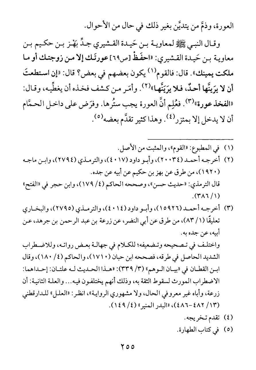 وقال النبي - صلى الله عليه وسلم - لمعاوية بن حَيدة القشيري جدِّ بَهْز بن حكيم بن معاوية بن حَيدة القشيري: «احفَظْ [ص ٦٩] عورتَك إلا من زوجتك أو ما ملكت يمينك». قال: فالقوم (¬١) يكون بعضهم في بعض؟ قال: «إن استطعتَ أن لا يرَينَّها أحدٌ، فلا يرَيَنَّها» (¬٢). وأمَر من كشف فخذه أن يغطِّيه، وقال: «الفخذ عورة» (¬٣).