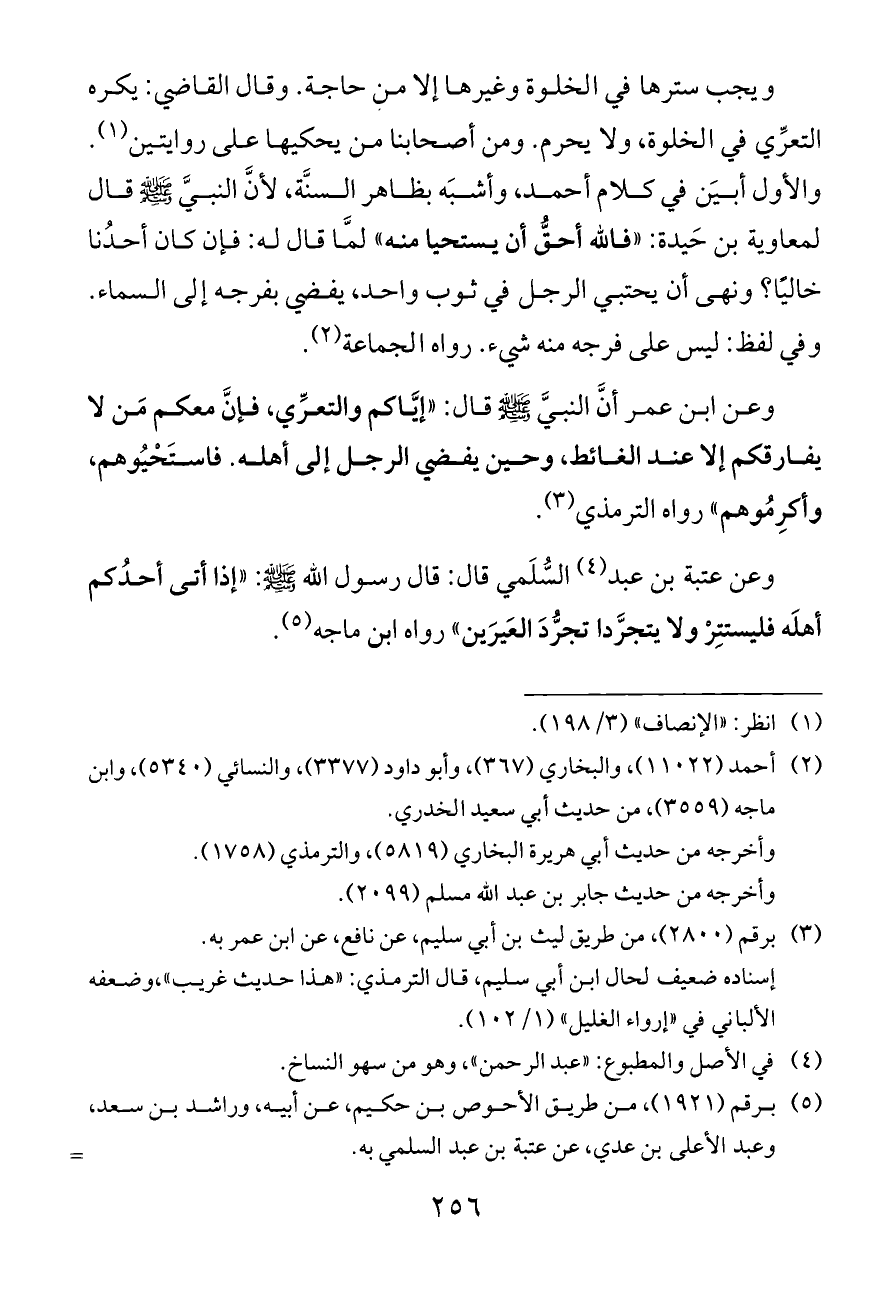 ويجب سترها في الخلوة وغيرها إلا من حاجة. وقال القاضي: يكره التعرِّي في الخلوة، ولا يحرم. ومن أصحابنا من يحكيها على روايتين (¬١). والأول أبيَن في كلام أحمد، وأشبَه بظاهر السنَّة، لأنَّ النبيَّ - صلى الله عليه وسلم - قال لمعاوية بن حَيدة: «فالله أحقُّ أن يستحيا منه» لمَّا قال له: فإن كان أحدُنا خاليًا؟ ونهى أن يحتبي الرجل في ثوب واحد، يفضي بفرجه إلى السماء. وفي لفظ: ليس على فرجه منه شيء. رواه الجماعة (¬٢).