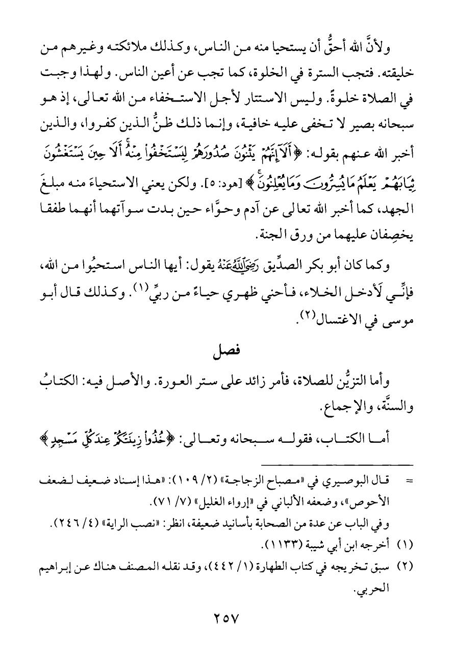 ولأنَّ الله أحقُّ أن يستحيا منه من الناس، وكذلك ملائكته وغيرهم من خليقته. فتجب السترة في الخلوة، كما تجب عن أعين الناس. ولهذا وجبت في الصلاة خلوةً. وليس الاستتار لأجل الاستخفاء من الله تعالى، إذ هو سبحانه بصير لا تخفى عليه خافية، وإنما ذلك ظنُّ الذين كفروا، والذين أخبر الله عنهم بقوله: {أَلَا إِنَّهُمْ يَثْنُونَ صُدُورَهُمْ لِيَسْتَخْفُوا مِنْهُ أَلَا حِينَ يَسْتَغْشُونَ ثِيَابَهُمْ يَعْلَمُ مَا يُسِرُّونَ وَمَا يُعْلِنُونَ} [هود: ٥]. ولكن يعني الاستحياءَ منه مبلغَ الجهد، كما أخبر الله تعالى عن آدم وحوَّاء حين بدت سوآتهما أنهما طفقا يخصِفان عليهما من ورق الجنة.