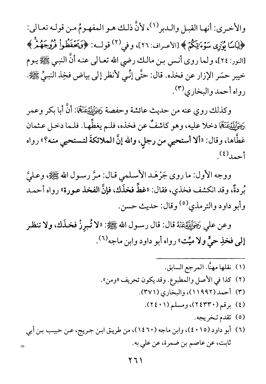 وعن علي - رضي الله عنه - قال: قال رسول الله - صلى الله عليه وسلم -: «لا تُبرِزْ فخذَك، ولا تنظر إلى فخذِ حيٍّ ولا ميِّت» رواه أبو داود وابن ماجه (¬٦).