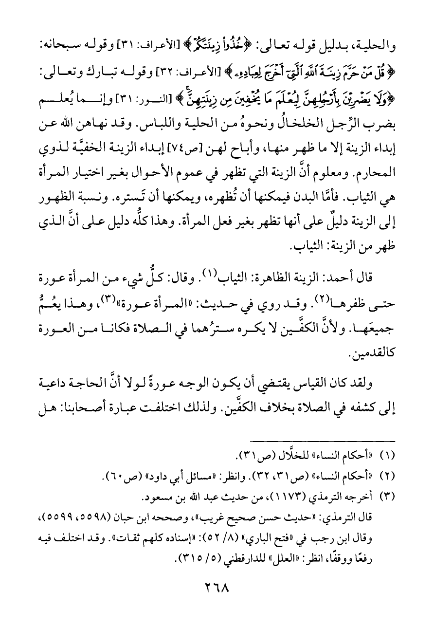 والحلية، بدليل قوله تعالى: {خُذُوا زِينَتَكُمْ} [الأعراف: ٣١] وقوله سبحانه: {قُلْ مَنْ حَرَّمَ زِينَةَ اللَّهِ الَّتِي أَخْرَجَ لِعِبَادِهِ} [الأعراف: ٣٢] وقوله تبارك وتعالى: {وَلَا يَضْرِبْنَ بِأَرْجُلِهِنَّ لِيُعْلَمَ مَا يُخْفِينَ مِنْ زِينَتِهِنَّ} [النور: ٣١] وإنما يُعلم بضرب الرِّجل الخلخالُ ونحوهُ من الحلية واللباس. وقد نهاهن الله عن إبداء الزينة إلا ما ظهر منها، وأباح لهن [ص ٧٤] إبداء الزينة الخفيَّة لذوي المحارم. ومعلوم أنَّ الزينة التي تظهر في عموم الأحوال بغير اختيار المرأة هي الثياب. فأمَّا البدن فيمكنها أن تُظهره، ويمكنها أن تَستره. ونسبة الظهور إلى الزينة دليلٌ على أنها تظهر بغير فعل المرأة. وهذا كلُّه دليل على أنَّ الذي ظهر من الزينة: الثياب.