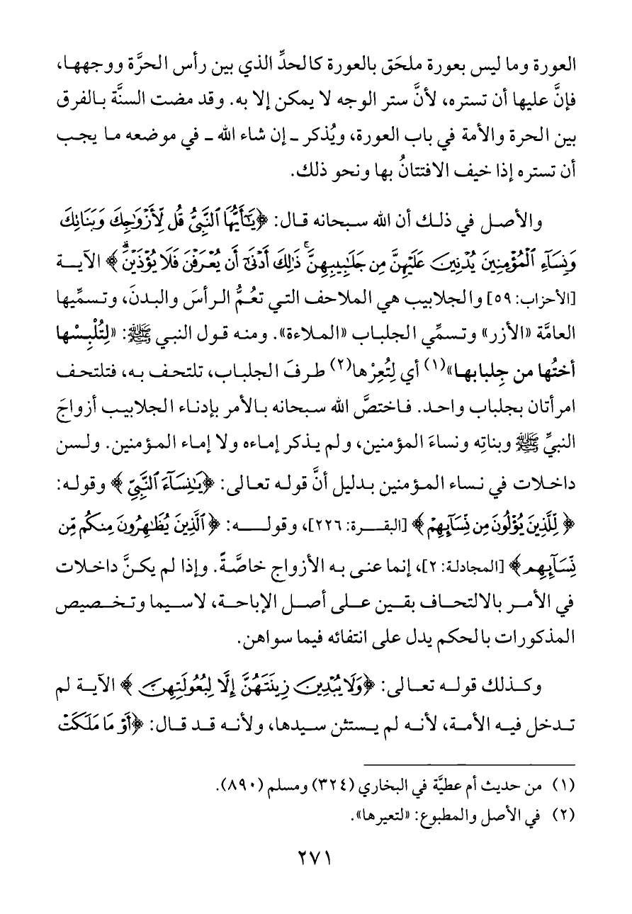 والأصل في ذلك أن الله سبحانه قال: {يَاأَيُّهَا النَّبِيُّ قُلْ لِأَزْوَاجِكَ وَبَنَاتِكَ وَنِسَاءِ الْمُؤْمِنِينَ يُدْنِينَ عَلَيْهِنَّ مِنْ جَلَابِيبِهِنَّ ذَلِكَ أَدْنَى أَنْ يُعْرَفْنَ فَلَا يُؤْذَيْنَ} الآية [الأحزاب: ٥٩] والجلابيب هي الملاحف التي تعُمُّ الرأسَ والبدنَ، وتسمِّيها العامَّة «الأزر» وتسمِّي الجلباب «الملاءة». ومنه قول النبي - صلى الله عليه وسلم -: «لِتُلْبِسْها أختُها من جِلبابها» (¬١) أي لِتُعِرْها (¬٢) طرفَ الجلباب، تلتحف به، فتلتحف امرأتان بجلباب واحد. فاختصَّ الله سبحانه بالأمر بإدناء الجلابيب أزواجَ النبيِّ - صلى الله عليه وسلم - وبناتِه ونساءَ المؤمنين، ولم يذكر إماءه ولا إماء المؤمنين. ولسن داخلات في نساء المؤمنين بدليل أنَّ قوله تعالى: {يَانِسَاءَ النَّبِيِّ} وقوله: {لِلَّذِينَ يُؤْلُونَ مِنْ نِسَائِهِمْ} [البقرة: ٢٢٦]، وقوله: {الَّذِينَ يُظَاهِرُونَ مِنْكُمْ مِنْ نِسَائِهِمْ} [المجادلة: ٢]، إنما عنى به الأزواج خاصَّةً. وإذا لم يكنَّ داخلات في الأمر بالالتحاف بقين على أصل الإباحة، لاسيما وتخصيص المذكورات بالحكم يدل على انتفائه فيما سواهن.