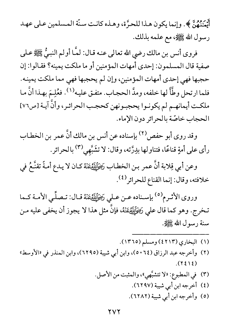 فروى أنس بن مالك رضي الله تعالى عنه قال: لمَّا أولم النبيُّ - صلى الله عليه وسلم - على صفية قال المسلمون: إحدى أمهات المؤمنين أو ما ملكت يمينه؟ فقالوا: إن حجبها فهي إحدى أمهات المؤمنين، وإن لم يحجبها فهي مما ملكت يمينه. فلما ارتحل وطَّأَ لها خلفه، ومدَّ الحجاب. متفق عليه (¬١). فعُلِمَ بهذا أنَّ ما ملكت أيمانهم لم يكونوا يحجبونهن كحجب الحرائر، وأنَّ آية [ص ٧٦] الحجاب خاصّة بالحرائر دون الإماء.