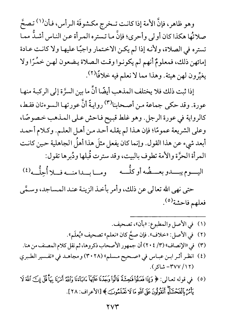 وهو ظاهر، فإنَّ الأمة إذا كانت تخرج مكشوفَة الرأس، فأن (¬١) تصحَّ صلاتُها هكذا كان أولى وأحرى؛ فإنَّ ما تستره المرأة عن الناس أشدُّ مما تستره في الصلاة، ولأنه إذا لم يكن الاختمار واجبًا عليها ولا كانت عادة إمائهن ذلك، فمعلومٌ أنهم لم يكونوا وقت الصلاة يضعون لهن خمُرًا ولا يغيِّرون لهن هيئة. وهذا مما لا نعلم فيه خلافًا (¬٢).