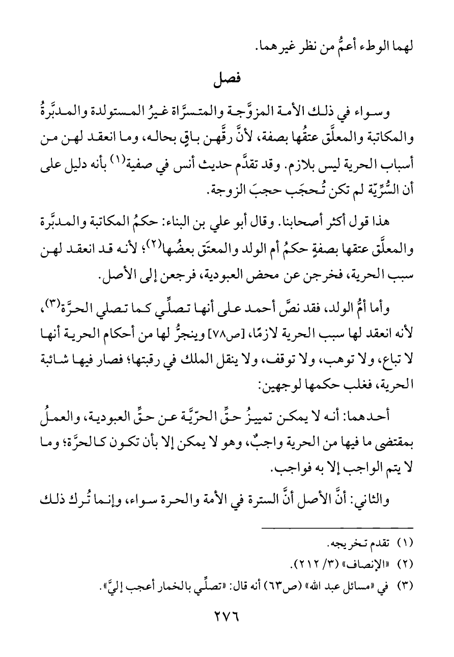 وأما أمُّ الولد، فقد نصَّ أحمد على أنها تصلِّي كما تصلي الحرَّة (¬٣)، لأنه انعقد لها سبب الحرية لازمًا، [ص ٧٨] وينجرُّ لها من أحكام الحرية أنها لا تباع، ولا توهب، ولا توقف، ولا ينقل الملك في رقبتها؛ فصار فيها شائبة الحرية، فغلب حكمها لوجهين: