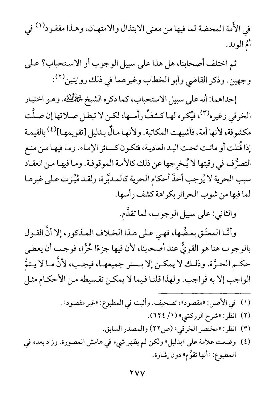 إحداهما: أنه على سبيل الاستحباب، كما ذكره الشيخ - رحمه الله -. وهو اختيار الخرقي وغيره (¬٣)، فيُكره لها كشفُ رأسها، لكن لا تبطل صلاتها إن صلَّت مكشوفة، لأنها أمة، فأشبهت المكاتبة. ولأنها مالٌ بدليل [تقويمها] (¬٤) بالقيمة إذا قُتلت أو ماتت تحت اليد العادية، فتكون كسائر الإماء. وما فيها من منع التصرُّف في رقبتها لا يُخرِجها عن ذلك كالأمة الموقوفة. وما فيها من انعقاد سبب الحرية لا يُوجب أخذَ أحكام الحرية كالمدبَّرة، ولقد مُيِّزت على غيرها لما فيها من شوب الحرائر بكراهة كشف رأسها.