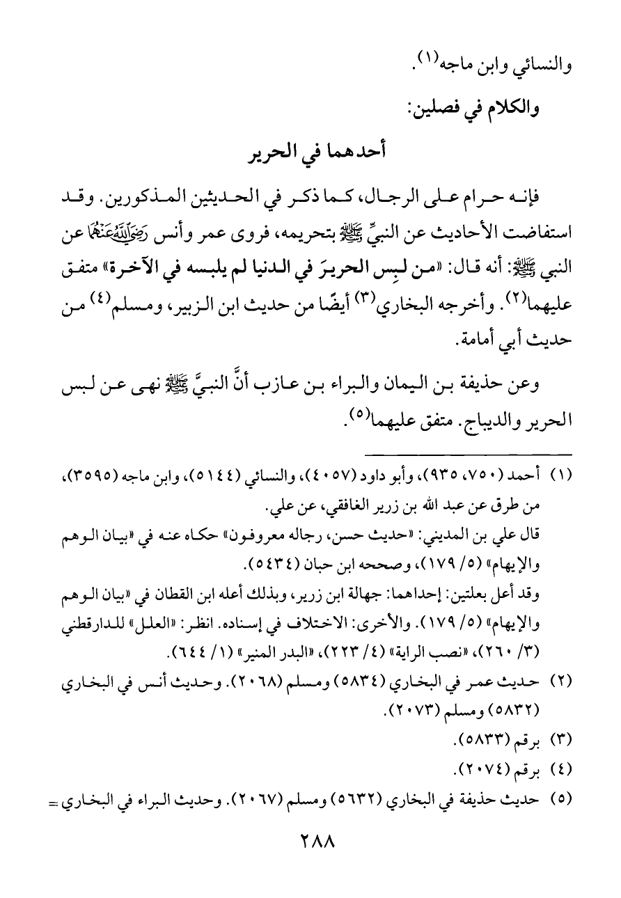 فإنه حرام على الرجال، كما ذكر في الحديثين المذكورين. وقد استفاضت الأحاديث عن النبيِّ - صلى الله عليه وسلم - بتحريمه، فروى عمر وأنس - رضي الله عنهما - عن النبي - صلى الله عليه وسلم -: أنه قال: «من لبِس الحريرَ في الدنيا لم يلبسه في الآخرة» متفق عليهما (¬٢). وأخرجه البخاري (¬٣) أيضًا من حديث ابن الزبير، ومسلم (¬٤) من حديث أبي أمامة.