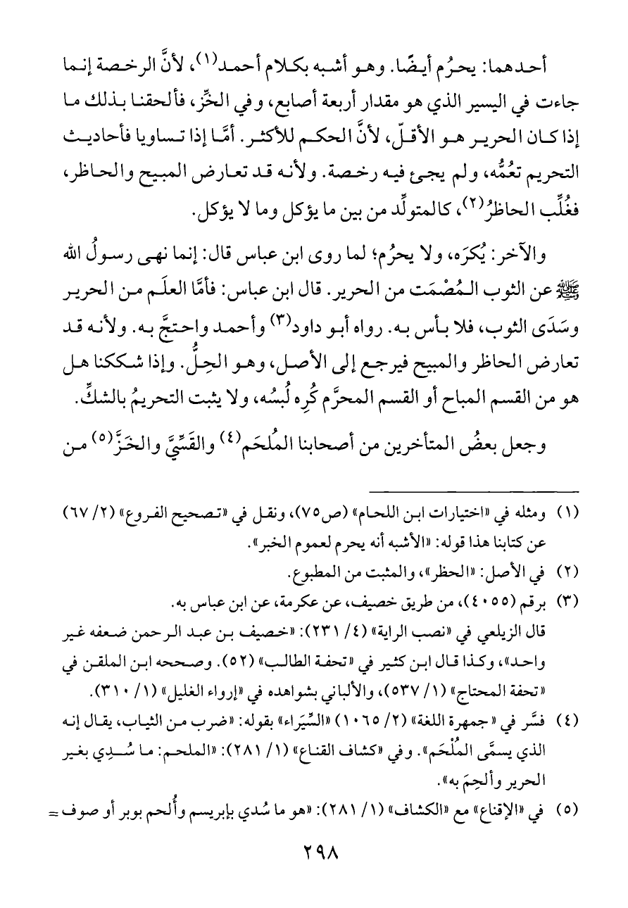(¬٥) في «الإقناع» مع «الكشاف» (١/ ٢٨١): «هو ما سُدي بإبريسم وأُلحم بوبر أو صوف ونحوه». وانظر ما يأتي (ص ٣٠٥) أن الخزّ اسم لثلاثة أشياء.