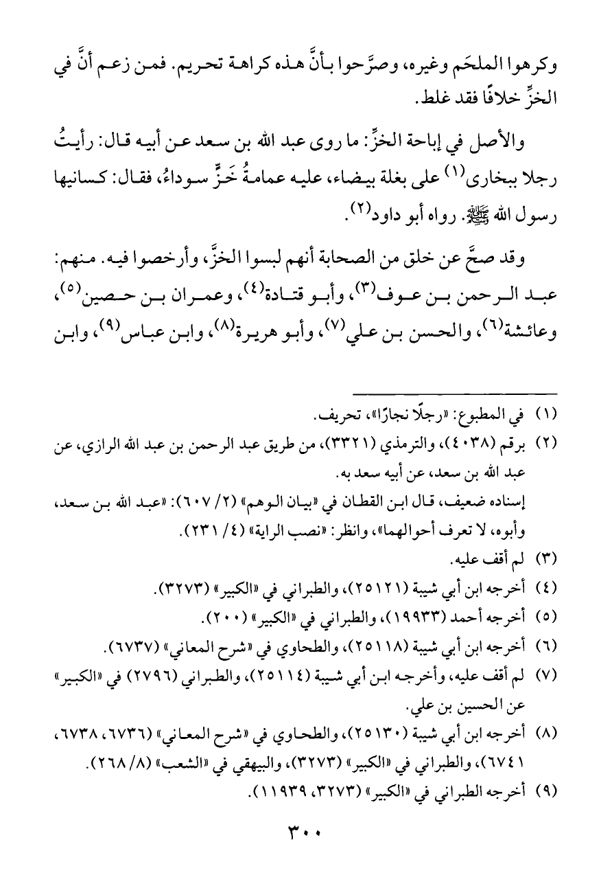 وقد صحَّ عن خلق من الصحابة أنهم لبسوا الخزَّ، وأرخصوا فيه. منهم: عبد الرحمن بن عوف (¬٣)، وأبو قتادة (¬٤)، وعمران بن حصين (¬٥)، وعائشة (¬٦)، والحسن بن علي (¬٧)، وأبو هريرة (¬٨)، وابن عباس (¬٩)، وابن