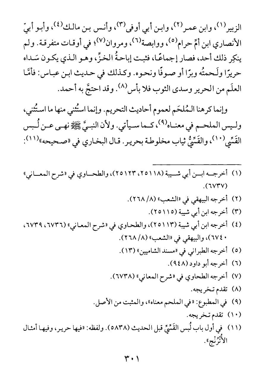 الزبير (¬١)، وابن عمر (¬٢)، وابن أبي أوفى (¬٣)، وأنس بن مالك (¬٤)، وأبو أبيّ الأنصاري ابن أمِّ حرام (¬٥)، ووابصة (¬٦)، ومروان (¬٧)؛ في أوقات متفرقة. ولم ينكِر ذلك أحد، فصار إجماعًا، فثبت إباحةُ الخزِّ، وهو الذي يكون سَداه حريرًا ولَحمتُه وبرًا أو صوفًا ونحوه. وكذلك في حديث ابن عباس: فأمَّا العلَم من الحرير وسدى الثوب فلا بأس (¬٨). وقد احتجَّ به أحمد.