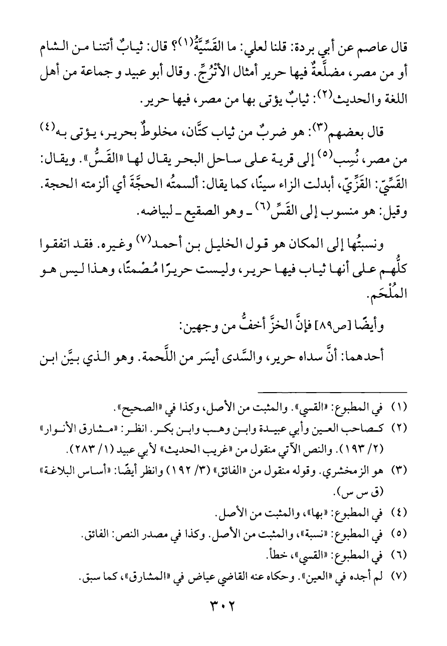 قال بعضهم (¬٣): هو ضربٌ من ثياب كتَّان، مخلوطٌ بحرير، يؤتى به (¬٤) من مصر، نُسِب (¬٥) إلى قرية على ساحل البحر يقال لها «القَسُّ». ويقال: القَسِّيّ: القَزِّيّ، أبدلت الزاء سينًا، كما يقال: ألسمتُه الحجَّةَ أي ألزمته الحجة. وقيل: هو منسوب إلى القَسِّ (¬٦) ــ وهو الصقيع ــ لبياضه.