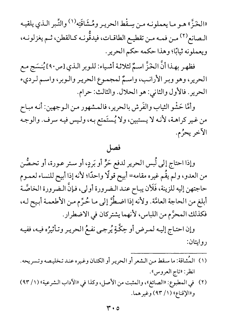 فظهر بهذا أنَّ الخَزَّ اسمٌ لثلاثة أشياء: للوبر الذي [ص ٩٠] يُنسَج مع الحرير، وهو وبر الأرانب، واسمٌ لمجموع الحرير والوبر، واسم لرديء الحرير. فالأول والثاني: هو الحلال. والثالث: حرام.