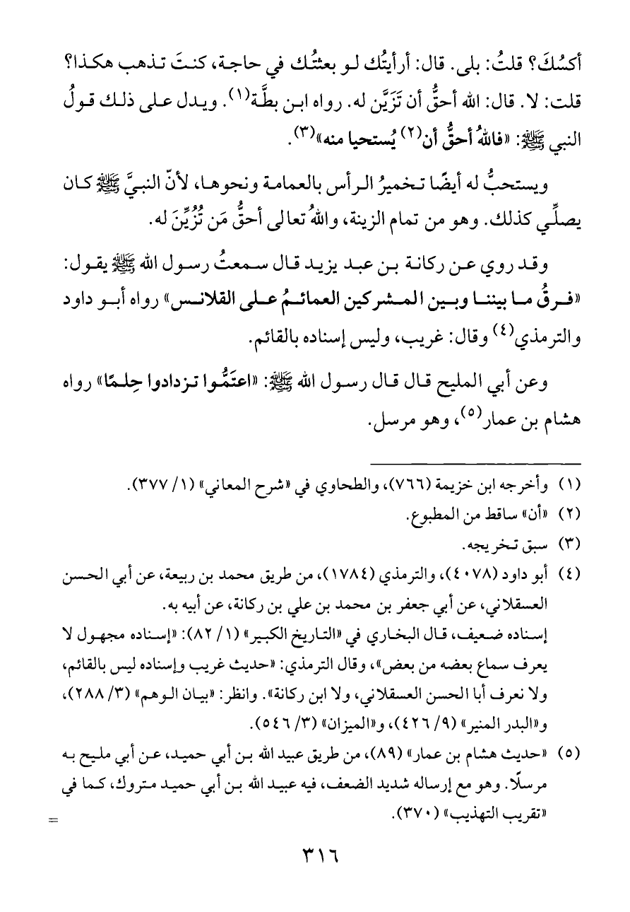 وعن أبي المليح قال قال رسول الله - صلى الله عليه وسلم -: «اعتَمُّوا تزدادوا حِلمًا» رواه هشام بن عمار (¬٥)، وهو مرسل.