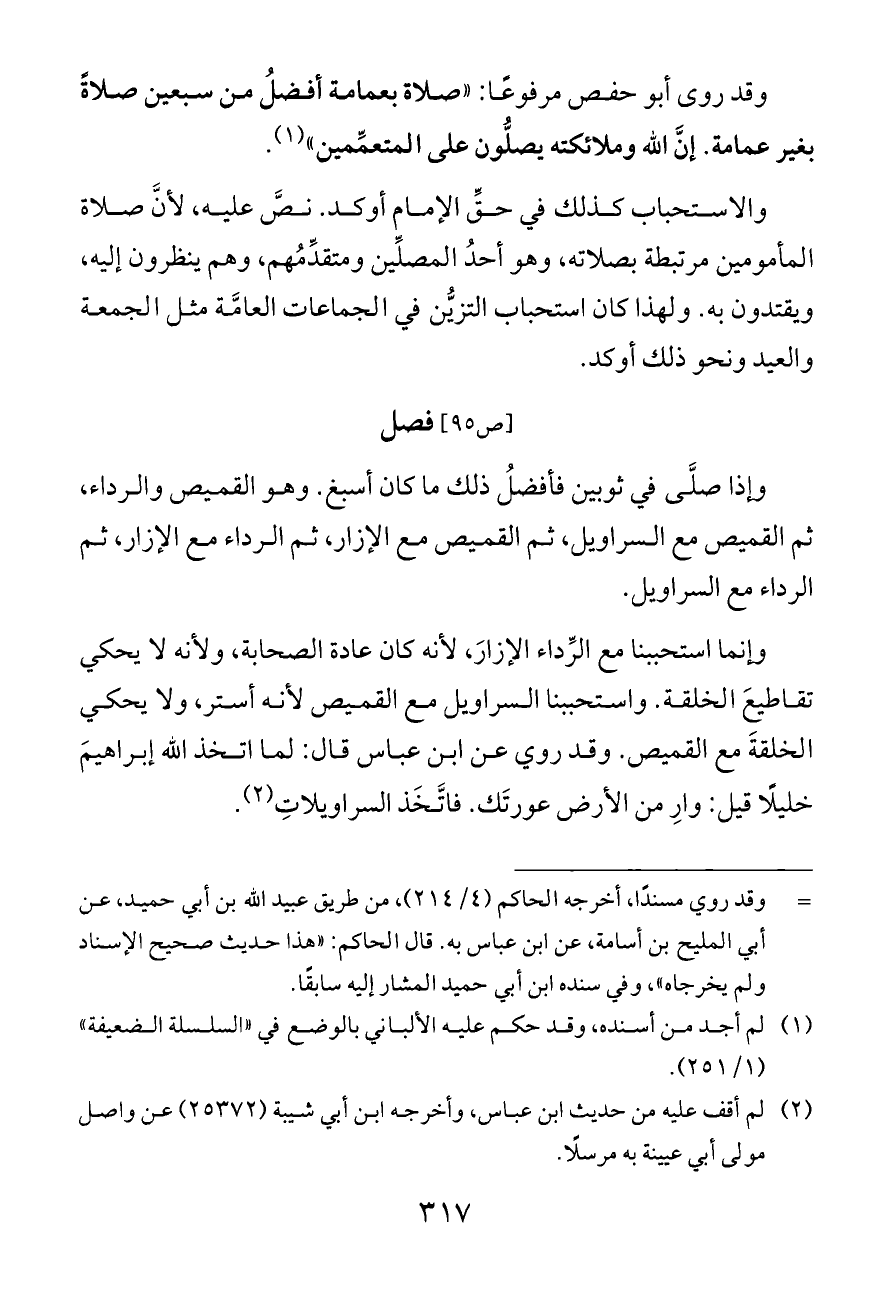 وقد روى أبو حفص مرفوعًا: «صلاة بعمامة أفضلُ من سبعين صلاةً بغير عمامة. إنَّ الله وملائكته يصلُّون على المتعمِّمين» (¬١).