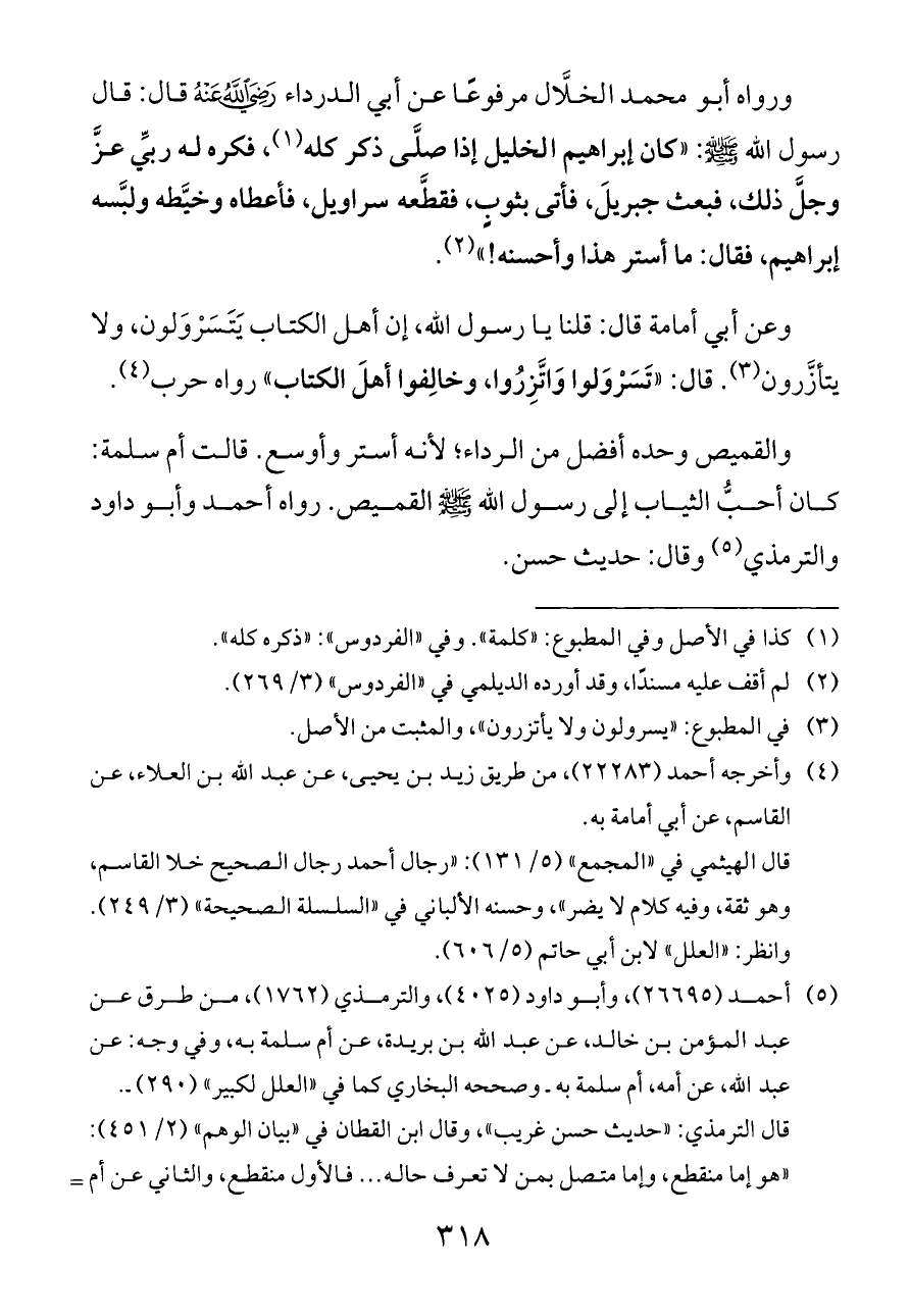 ورواه أبو محمد الخلَّال مرفوعًا عن أبي الدرداء - رضي الله عنه - قال: قال رسول الله - صلى الله عليه وسلم -: «كان إبراهيم الخليل إذا صلَّى ذكر كله (¬١)، فكره له ربِّي عزَّ وجلَّ ذلك، فبعث جبريلَ، فأتى بثوبٍ، فقطَّعه سراويل، فأعطاه وخيَّطه ولبَّسه إبراهيم، فقال: ما أستر هذا وأحسنه!» (¬٢).