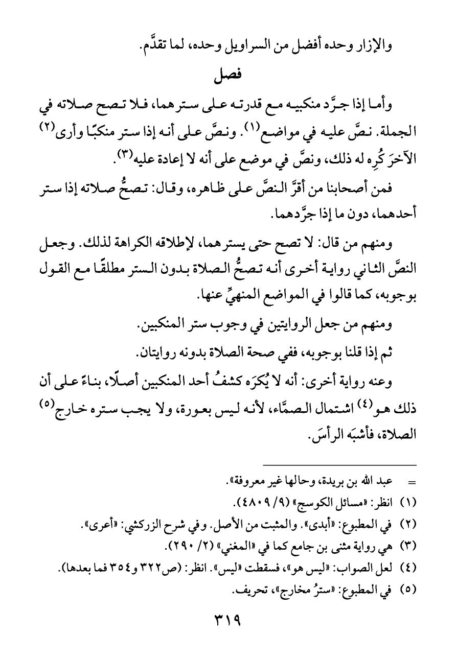 ومنهم من قال: لا تصح حتى يسترهما، لإطلاقه الكراهة لذلك. وجعل النصَّ الثاني رواية أخرى أنه تصحُّ الصلاة بدون الستر مطلقًا مع القول بوجوبه، كما قالوا في المواضع المنهيِّ عنها.