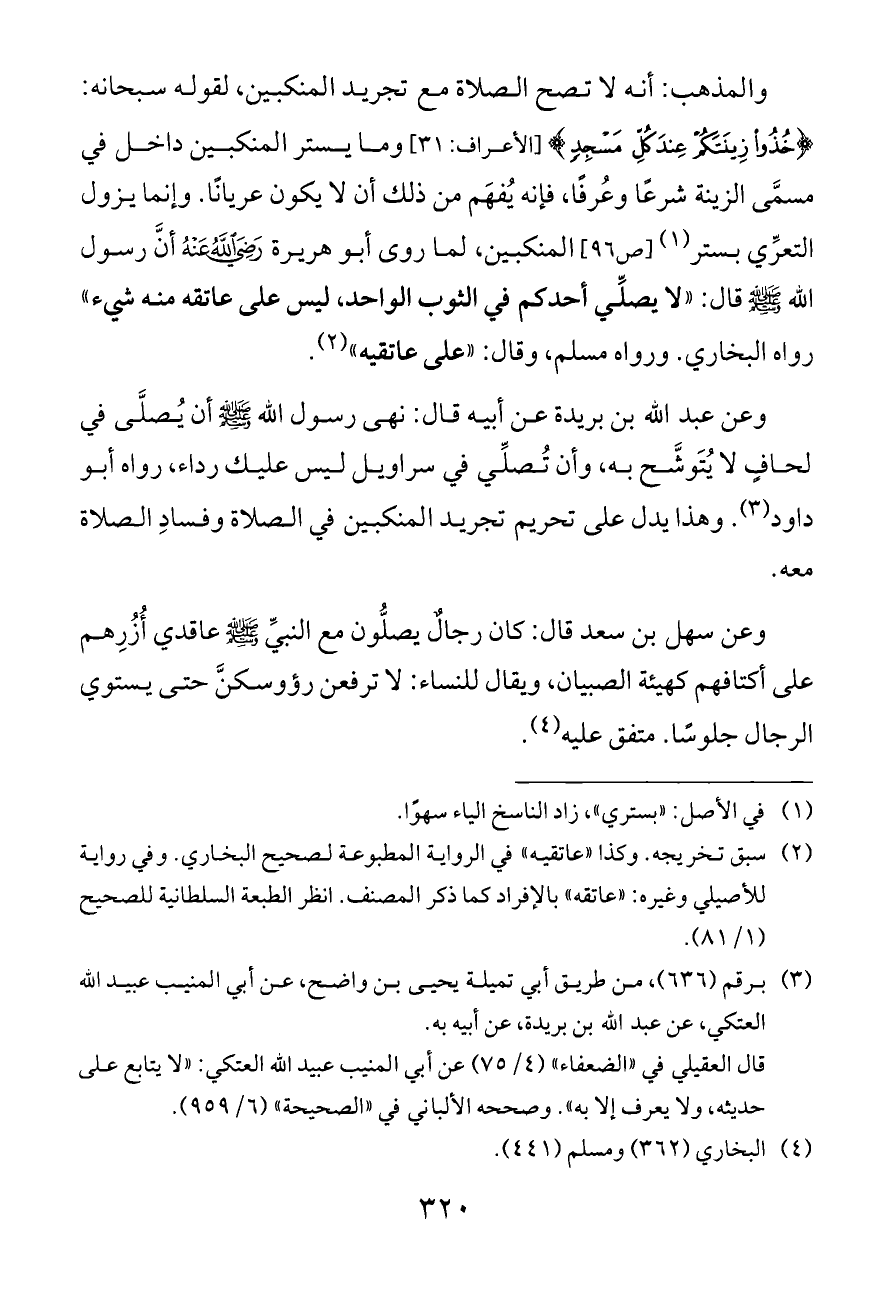 والمذهب: أنه لا تصح الصلاة مع تجريد المنكبين، لقوله سبحانه: {خُذُوا زِينَتَكُمْ عِنْدَ كُلِّ مَسْجِدٍ} [الأعراف: ٣١] وما يستر المنكبين داخل في مسمَّى الزينة شرعًا وعُرفًا، فإنه يُفهَم من ذلك أن لا يكون عريانًا. وإنما يزول التعرِّي بستر (¬١) [ص ٩٦] المنكبين، لما روى أبو هريرة - رضي الله عنه - أنَّ رسول الله - صلى الله عليه وسلم - قال: «لا يصلِّي أحدكم في الثوب الواحد، ليس على عاتقه منه شيء» رواه البخاري. ورواه مسلم، وقال: «على عاتقيه» (¬٢).