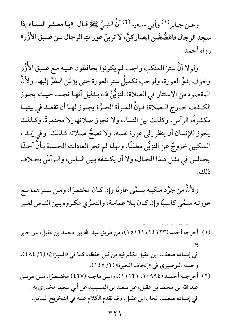 وأبي سعيد (¬٢) أنَّ النبيَّ - صلى الله عليه وسلم - قال: «يا معشر النساء إذا سجد الرجال فاغضُضَن أبصاركنَّ، لا ترينَ عوراتِ الرجال من ضيق الأزُر» رواه أحمد.