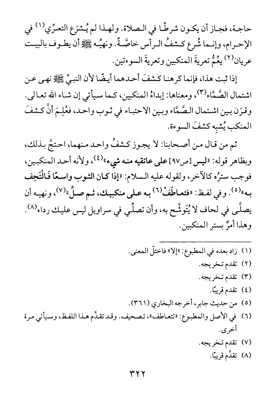 إذا ثبت هذا، فإنما كرهنا كشفَ أحدهما أيضًا لأن النبيَّ - صلى الله عليه وسلم - نهى عن اشتمال الصَّمَّاء (¬٣)، ومعناها: إبداءُ المنكبين، كما سيأتي إن شاء الله تعالى. وقرَن بين اشتمال الصَّمَّاء وبين الاحتباء في ثوب واحد، فعُلِمَ أنَّ كشفَ المنكب يُشبِه كشفَ السوءة.