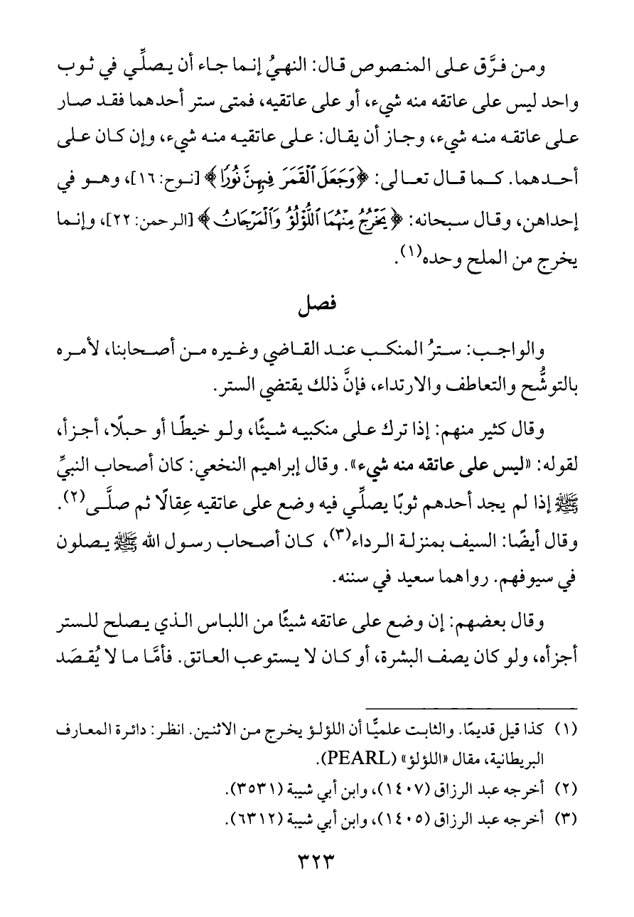 ومن فرَّق على المنصوص قال: النهيُ إنما جاء أن يصلِّي في ثوب واحد ليس على عاتقه منه شيء، أو على عاتقيه، فمتى ستر أحدهما فقد صار على عاتقه منه شيء، وجاز أن يقال: على عاتقيه منه شيء، وإن كان على أحدهما. كما قال تعالى: {وَجَعَلَ الْقَمَرَ فِيهِنَّ نُورًا} [نوح: ١٦]، وهو في إحداهن، وقال سبحانه: {يَخْرُجُ مِنْهُمَا اللُّؤْلُؤُ وَالْمَرْجَانُ} [الرحمن: ٢٢]، وإنما يخرج من الملح وحده (¬١).