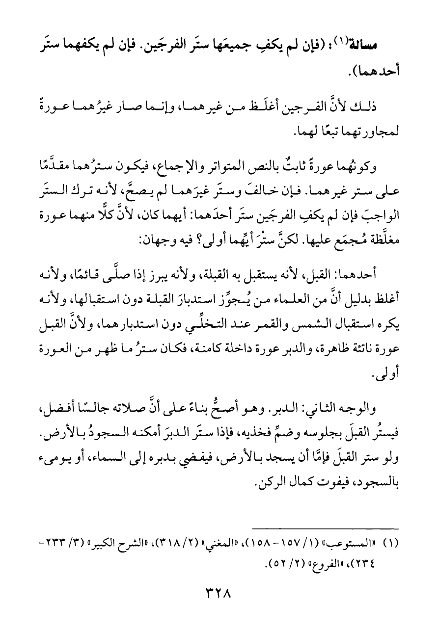 وكونُهما عورةً ثابتٌ بالنص المتواتر والإجماع، فيكون سترُهما مقدَّمًا على ستر غيرهما. فإن خالفَ وستَر غيرَهما لم يصحَّ، لأنه ترك الستَر الواجبَ فإن لم يكفِ الفرجَين ستَر أحدَهما: أيهما كان، لأنَّ كلًّا منهما عورة مغلَّظة مُجمَع عليها. لكنَّ ستْرَ أيِّهما أولى؟ فيه وجهان: