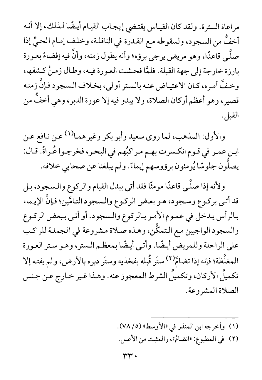 والأول: المذهب، لما روى سعيد وأبو بكر وغيرهما (¬١) عن نافع عن ابن عمر في قوم انكسرت بهم مراكبُهم في البحر، فخرجوا عُراةً. قال: يصلُّون جلوسًا يُومئون برؤوسهم إيماءً. ولم يبلغنا عن صحابي خلافه.