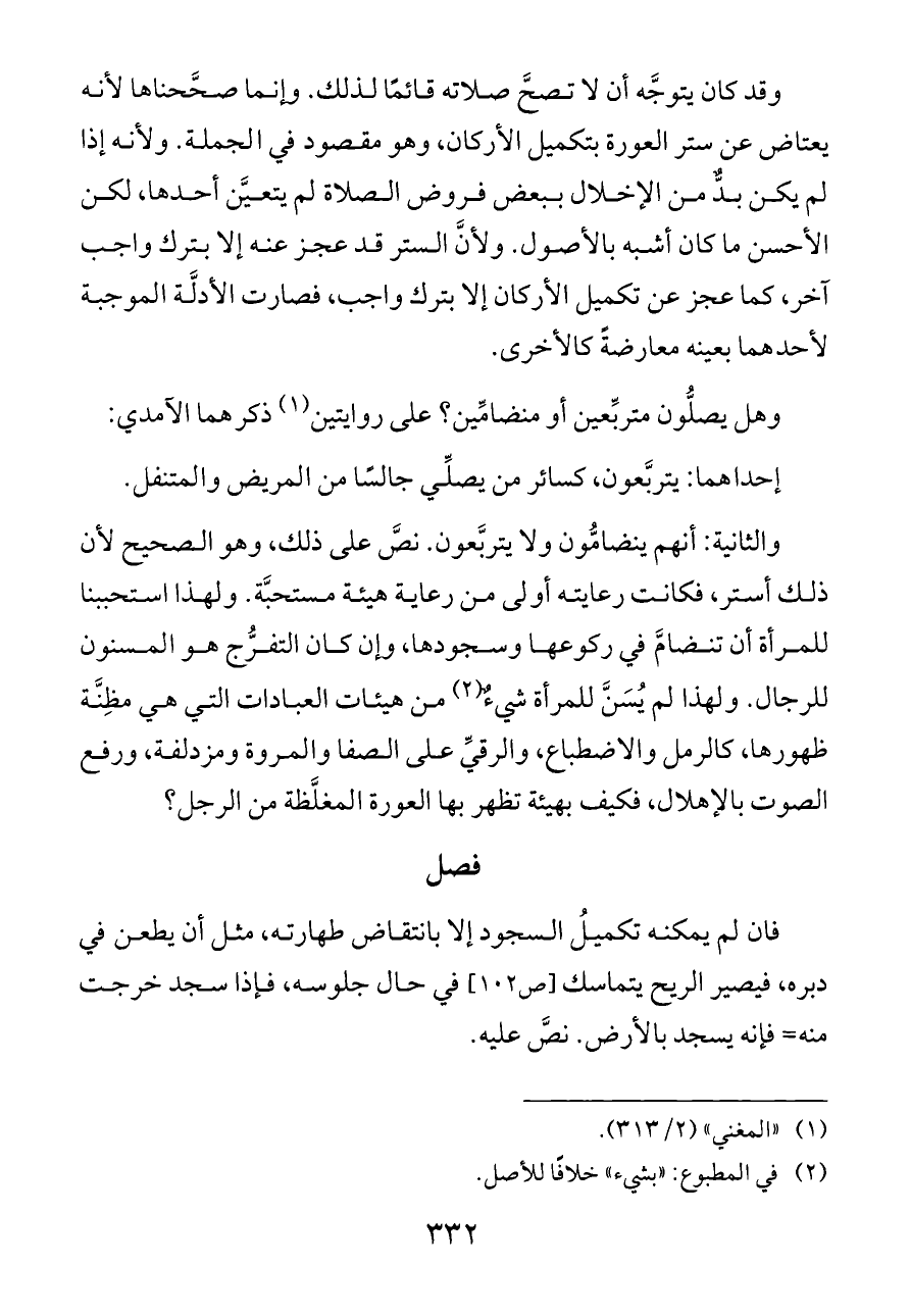 والثانية: أنهم ينضامُّون ولا يتربَّعون. نصَّ على ذلك، وهو الصحيح لأن ذلك أستر، فكانت رعايته أولى من رعاية هيئة مستحبَّة. ولهذا استحببنا للمرأة أن تنضامَّ في ركوعها وسجودها، وإن كان التفرُّج هو المسنون للرجال. ولهذا لم يُسَنَّ للمرأة شيءٌ (¬٢) من هيئات العبادات التي هي مظِنَّة ظهورها، كالرمل والاضطباع، والرقيِّ على الصفا والمروة ومزدلفة، ورفع الصوت بالإهلال، فكيف بهيئة تظهر بها العورة المغلَّظة من الرجل؟