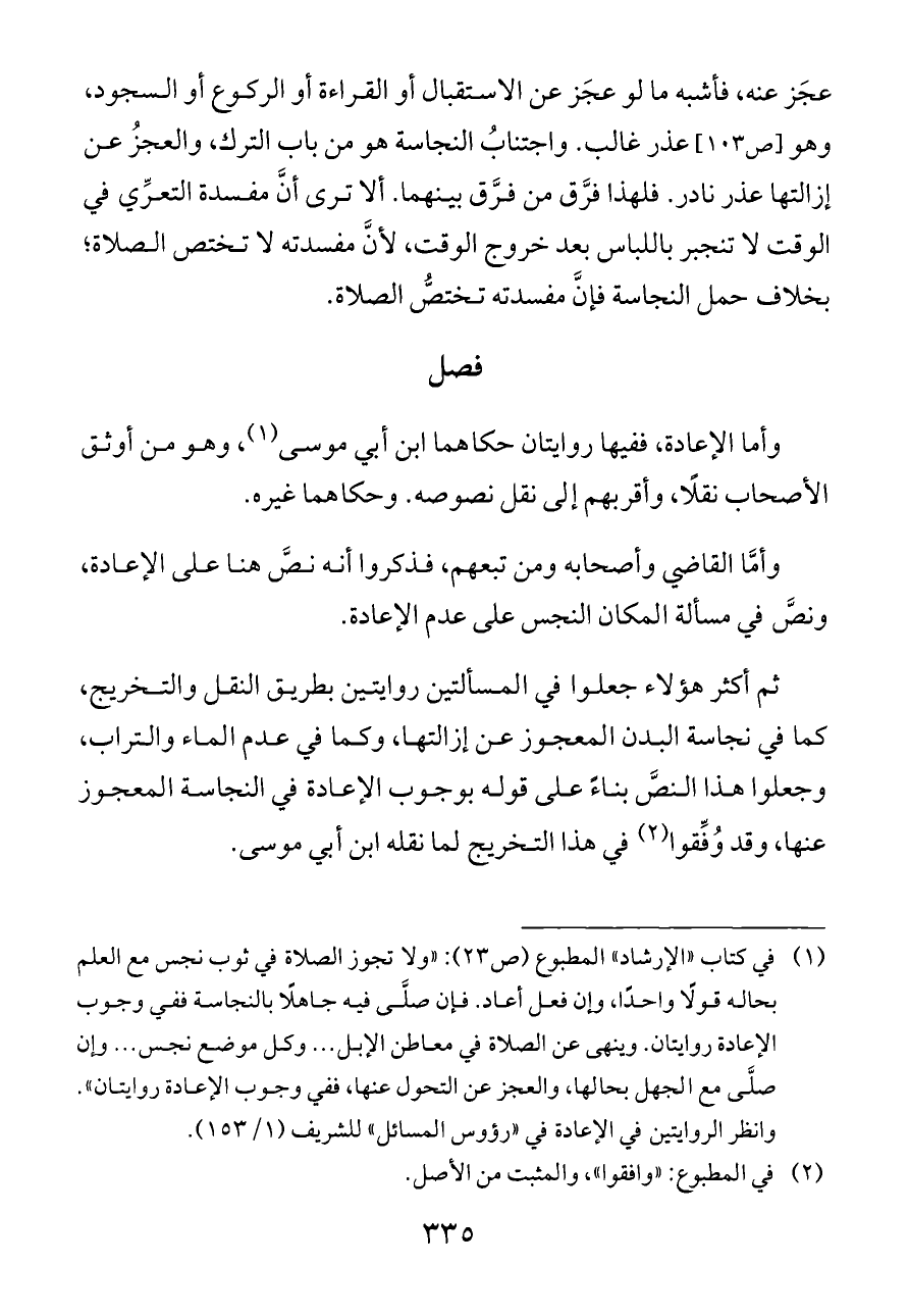(¬١) في كتاب «الإرشاد» المطبوع (ص ٢٣): «ولا تجوز الصلاة في ثوب نجس مع العلم بحاله قولًا واحدًا، وإن فعل أعاد. فإن صلَّى فيه جاهلًا بالنجاسة ففي وجوب الإعادة روايتان. وينهى عن الصلاة في معاطن الإبل ... وكل موضع نجس ... وإن صلَّى مع الجهل بحالها، والعجز عن التحول عنها، ففي وجوب الإعادة روايتان». وانظر الروايتين في الإعادة في «رؤوس المسائل» للشريف (١/ ١٥٣).