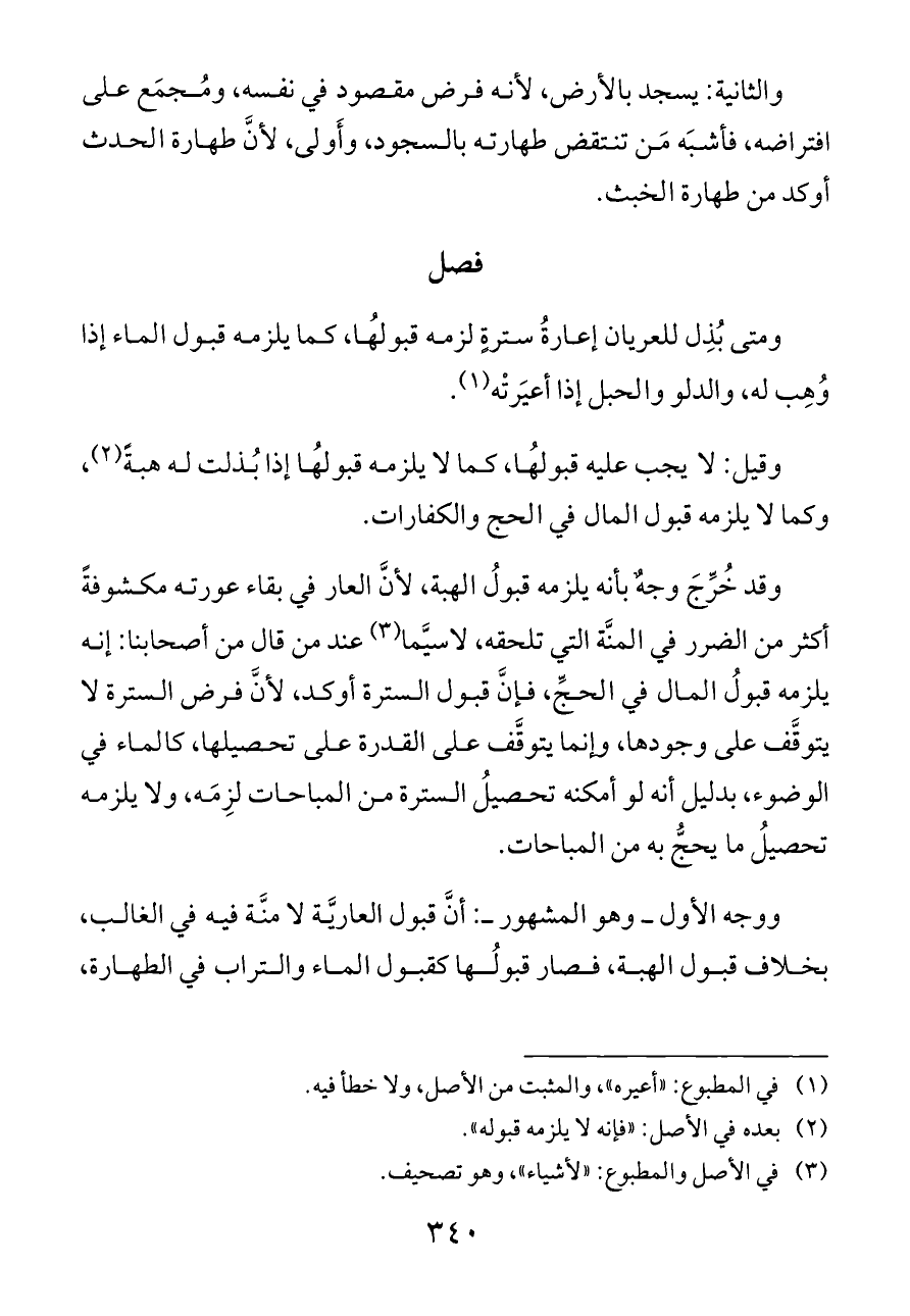 ووجه الأول ــ وهو المشهور ــ: أنَّ قبول العاريَّة لا منَّة فيه في الغالب، بخلاف قبول الهبة، فصار قبولُها كقبول الماء والتراب في الطهارة،