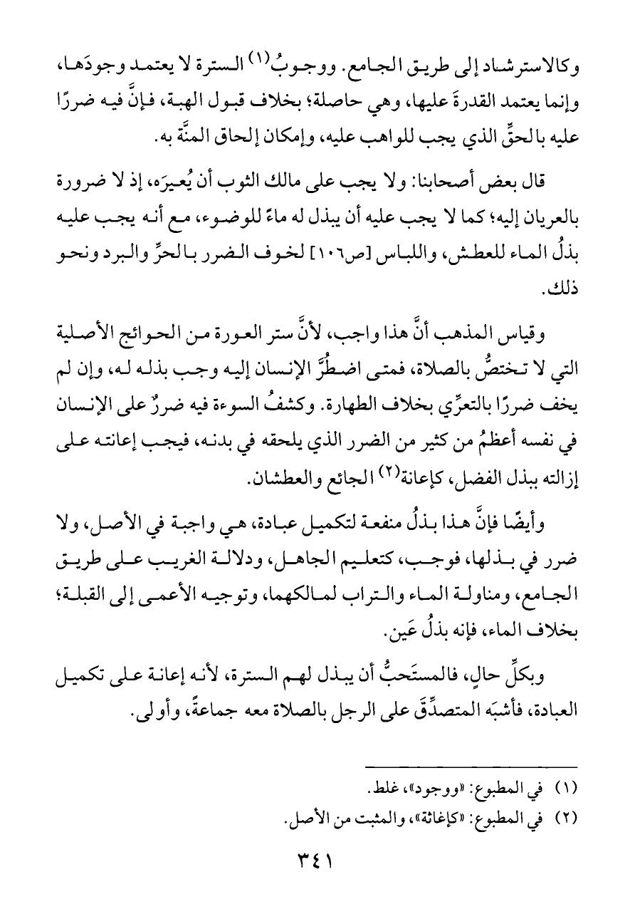 وقياس المذهب أنَّ هذا واجب، لأنَّ ستر العورة من الحوائج الأصلية التي لا تختصُّ بالصلاة، فمتى اضطُرَّ الإنسان إليه وجب بذله له، وإن لم يخف ضررًا بالتعرِّي بخلاف الطهارة. وكشفُ السوءة فيه ضررٌ على الإنسان في نفسه أعظمُ من كثير من الضرر الذي يلحقه في بدنه، فيجب إعانته على إزالته ببذل الفضل، كإعانة (¬٢) الجائع والعطشان.