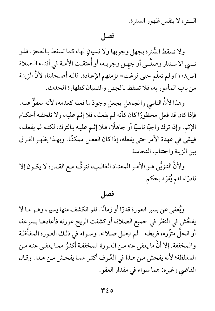 ولا تسقط السُّترة بجهل وجوبها ولا نسيانٍ لها، كما تسقط بالعجز. فلو نسي الاستتار وصلَّى أو جهِل وجوبه، أو أُعتقت الأمة في أثناء الصلاة [ص ١٠٨] ولم تعلَم حتى فرغت= لزمتهم الإعادة. قاله أصحابنا، لأنَّ الزينة من باب المأمور به، فلا تسقط بالجهل والنسيان كطهارة الحدث.