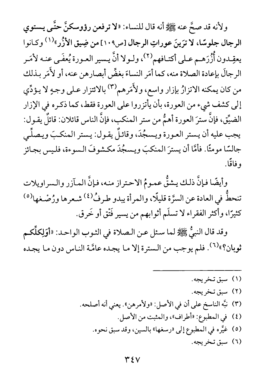 ولأنه قد صحَّ عنه - صلى الله عليه وسلم - أنه قال للنساء: «لا ترفعن رؤوسكنَّ حتَّى يستوي الرجال جلوسًا، لا ترَينَ عوراتِ الرجال [ص ١٠٩] من ضِيق الأزُر» (¬١) وكانوا يعقِدون أُزُرَهم على أكتافهم (¬٢)، ولولا أنَّ يسير العورة يُعفَى عنه لأمَر الرجالَ بإعادة الصلاة منه، كما أمَر النساءَ بغضِّ أبصارهن عنه، أو لأَمَر بذلك من كان يمكنه الاتزارُ بإزار واسع، ولأَمَرهم (¬٣) بالائتزار على وجهٍ لا يؤدِّي إلى كشف شيء من العورة، بأن يأتزروا على العورة فقط، كما ذكره في الإزار الضيِّق، فإنَّ سترَ العورة أهمُّ من ستر المنكب، فإنَّ الناس قائلان: قائلٌ يقول: يجب عليه أن يستر العورة ويسجُدَ، وقائلٌ يقول: يستر المنكبَ ويصلِّي جالسًا مومئًا. فأمَّا أن يسترَ المنكبَ ويسجُدَ مكشوفَ السوءة، فليس بجائز وفاقًا.